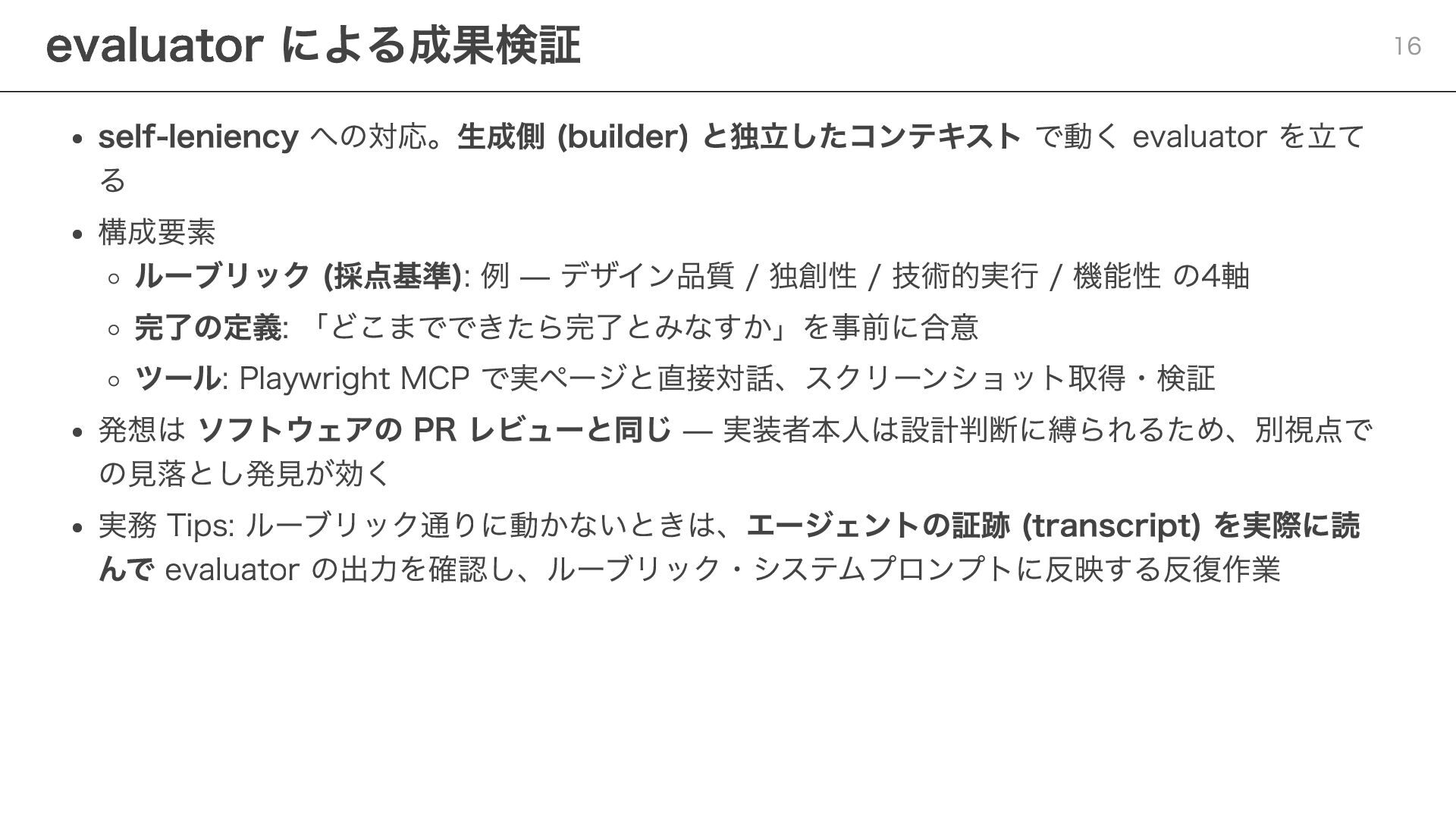 (採点基準): 例 — デザイン品質 / 独創性 / 技術的実行 / 機能性 の4軸 完了の定義: 「どこまでできたら完了とみなすか」を事前に合意 ツール: Playwright MCP で実ページと直接対話、スクリーンショット取得・検証 発想は ソフトウェアの PR レビューと同じ — 実装者本人は設計判断に縛られるため、別視点で の見落とし発見が効く 実務 Tips: ルーブリック通りに動かないときは、エージェントの証跡 (transcript) を実際に読 んで evaluator の出力を確認し、ルーブリック・システムプロンプトに反映する反復作業 evaluator による成果検証 16