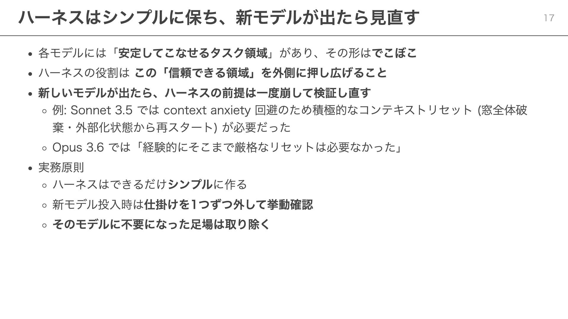 回避のため積極的なコンテキストリセット (窓全体破 棄・外部化状態から再スタート) が必要だった Opus 3.6 では「経験的にそこまで厳格なリセットは必要なかった」 実務原則 ハーネスはできるだけシンプルに作る 新モデル投入時は仕掛けを1つずつ外して挙動確認 そのモデルに不要になった足場は取り除く ハーネスはシンプルに保ち、新モデルが出たら見直す 17