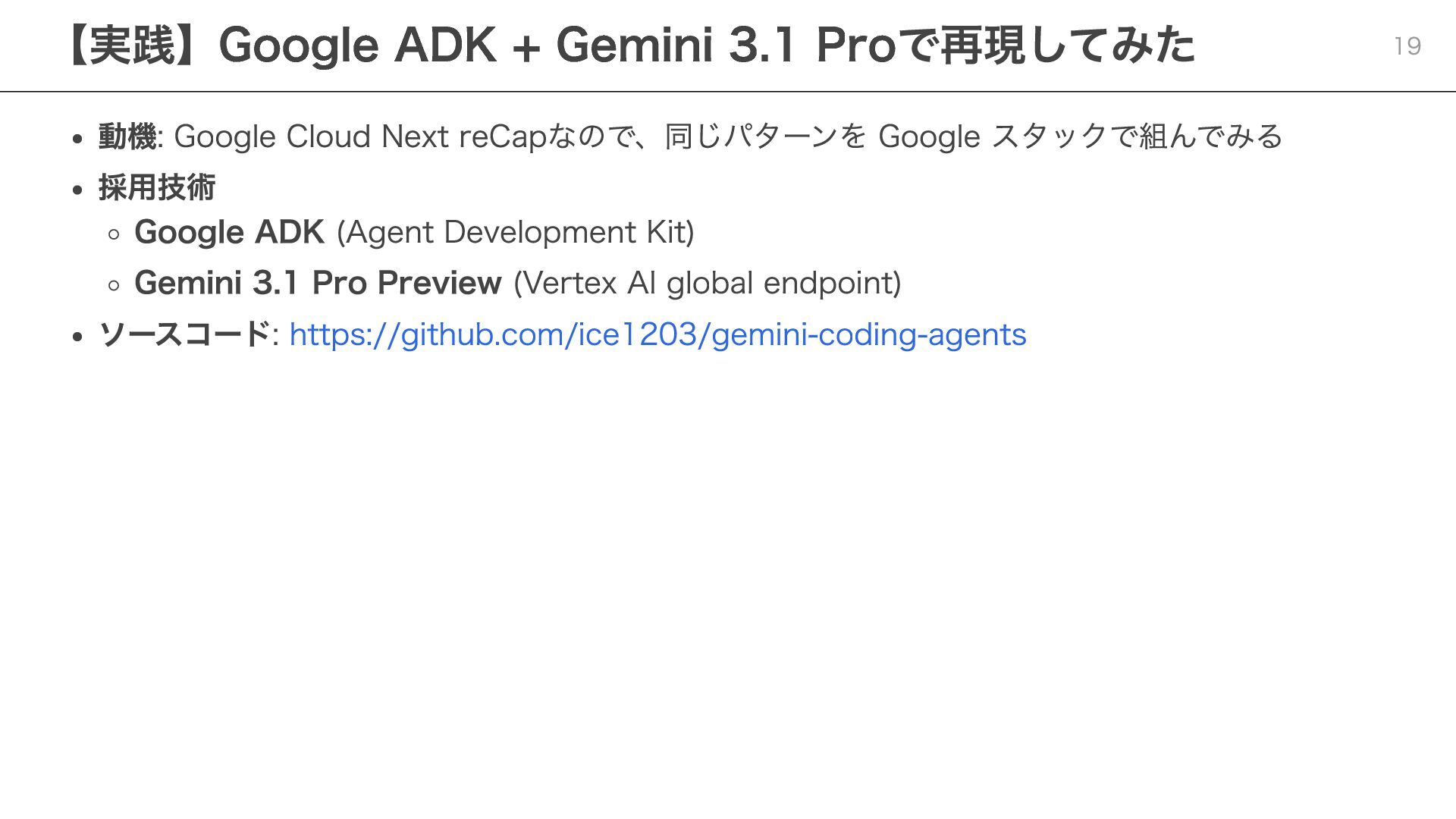 (Agent Development Kit) Gemini 3.1 Pro Preview (Vertex AI global endpoint) ソースコード: https://github.com/ice1203/gemini-coding-agents 【実践】Google ADK + Gemini 3.1 Proで再現してみた 19