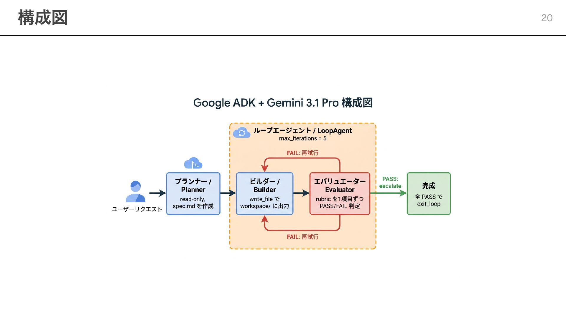 # builder <-> evaluator を最大5回ループ refine_loop = LoopAgent( name="RefineLoop", sub_agents=[builder,