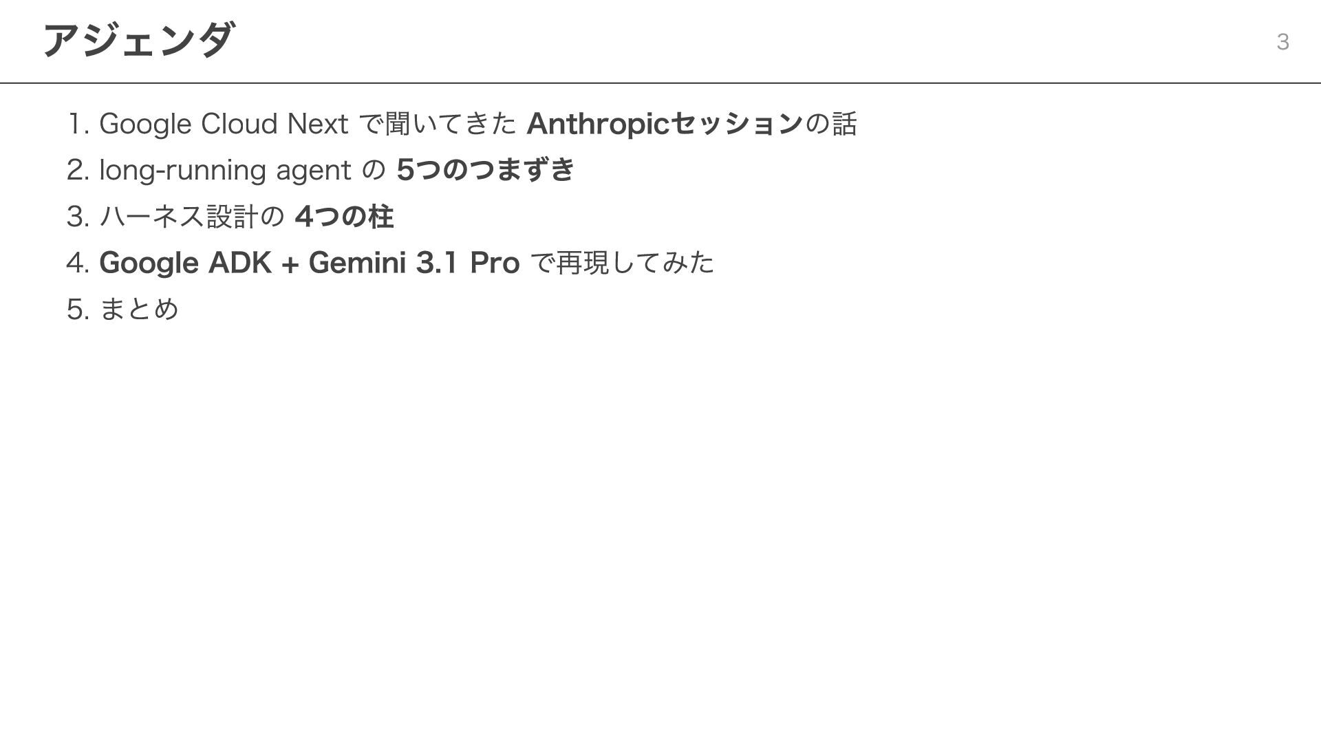 1. Google Cloud Next で聞いてきた Anthropicセッションの話 2. long-running agent の