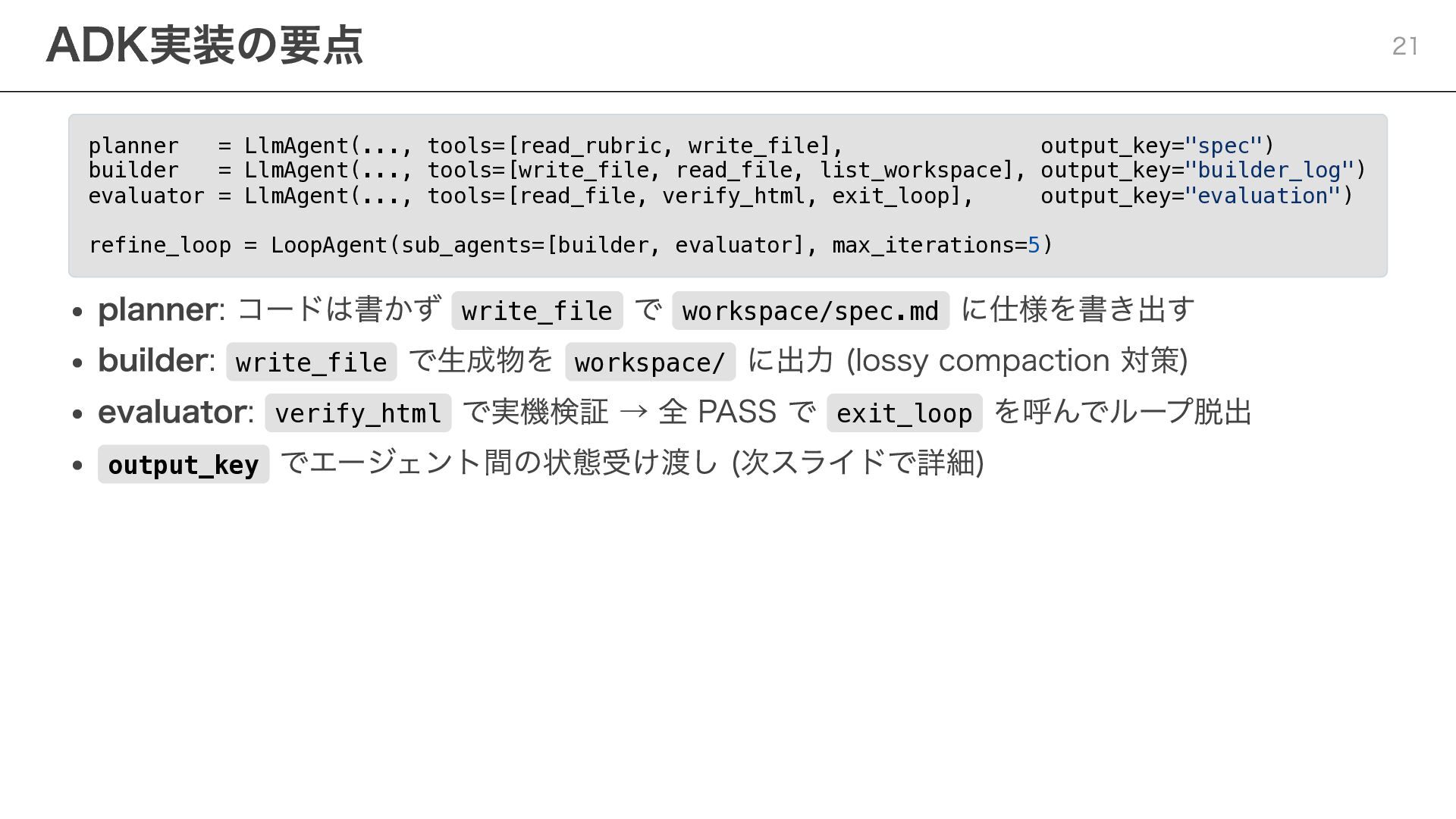 read_file, list_workspace], output_key="builder_log") evaluator = LlmAgent(..., tools=[read_file, verify_html, exit_loop], output_key="evaluation") refine_loop = LoopAgent(sub_agents=[builder, evaluator], max_iterations=5) planner: コードは書かず write_file で workspace/spec.md に仕様を書き出す builder: write_file で生成物を workspace/ に出力 (lossy compaction 対策) evaluator: verify_html で実機検証 → 全 PASS で exit_loop を呼んでループ脱出 output_key でエージェント間の状態受け渡し (次スライドで詳細) ADK実装の要点 21