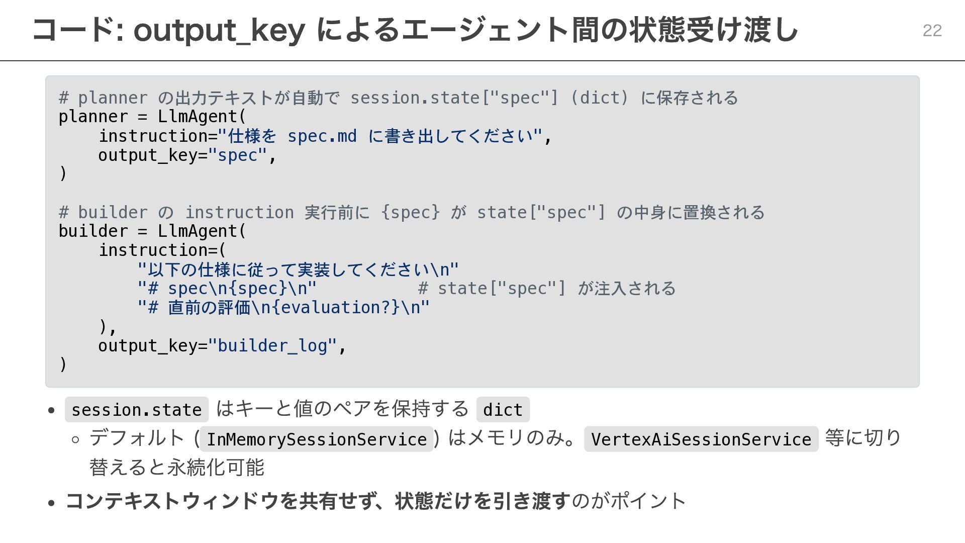 spec.md に書き出してください", output_key="spec", ) # builder の instruction 実行前に {spec} が state["spec"] の中身に置換される builder = LlmAgent( instruction=( "以下の仕様に従って実装してください\n" "# spec\n{spec}\n" # state["spec"] が注入される "# 直前の評価\n{evaluation?}\n" ), output_key="builder_log", ) session.state はキーと値のペアを保持する dict デフォルト ( InMemorySessionService ) はメモリのみ。 VertexAiSessionService 等に切り 替えると永続化可能 コンテキストウィンドウを共有せず、状態だけを引き渡すのがポイント コード: output_key によるエージェント間の状態受け渡し 22
