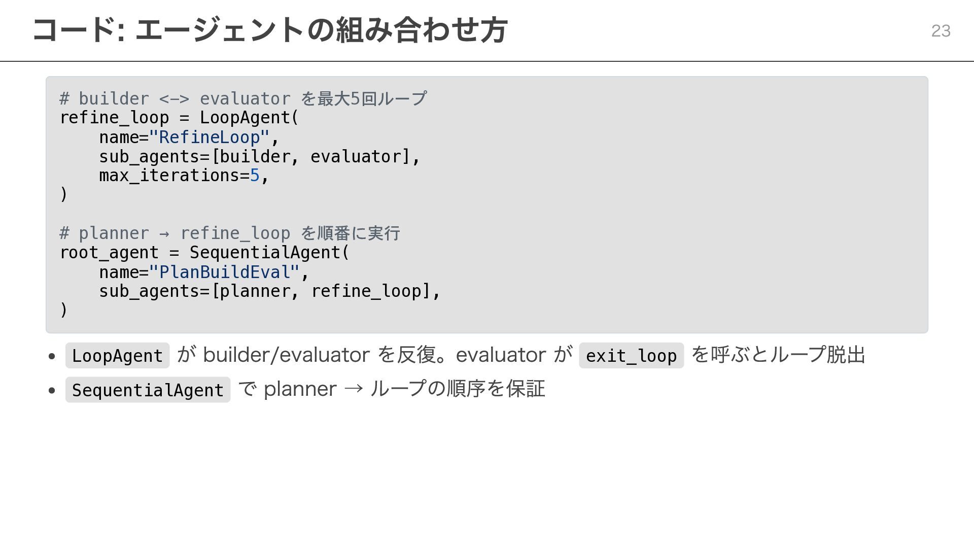 evaluator], max_iterations=5, ) # planner → refine_loop を順番に実行 root_agent = SequentialAgent( name="PlanBuildEval", sub_agents=[planner, refine_loop], ) LoopAgent が builder/evaluator を反復。evaluator が exit_loop を呼ぶとループ脱出 SequentialAgent で planner → ループの順序を保証 コード: エージェントの組み合わせ方 23