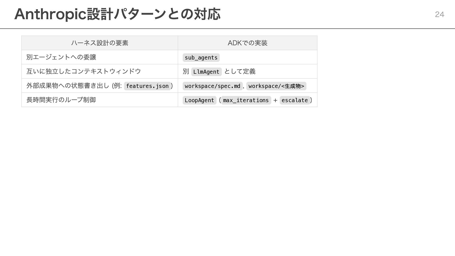 features.json ) workspace/spec.md , workspace/<生成物> 長時間実行のループ制御 LoopAgent ( max_iterations + escalate ) Anthropic設計パターンとの対応 24