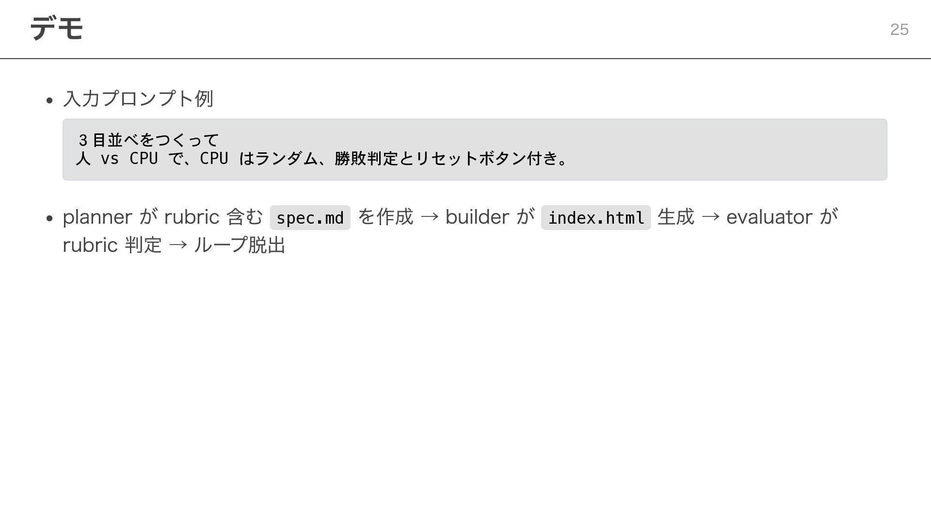 含む spec.md を作成 → builder が index.html 生成 → evaluator が rubric 判定 → ループ脱出 デモ 25