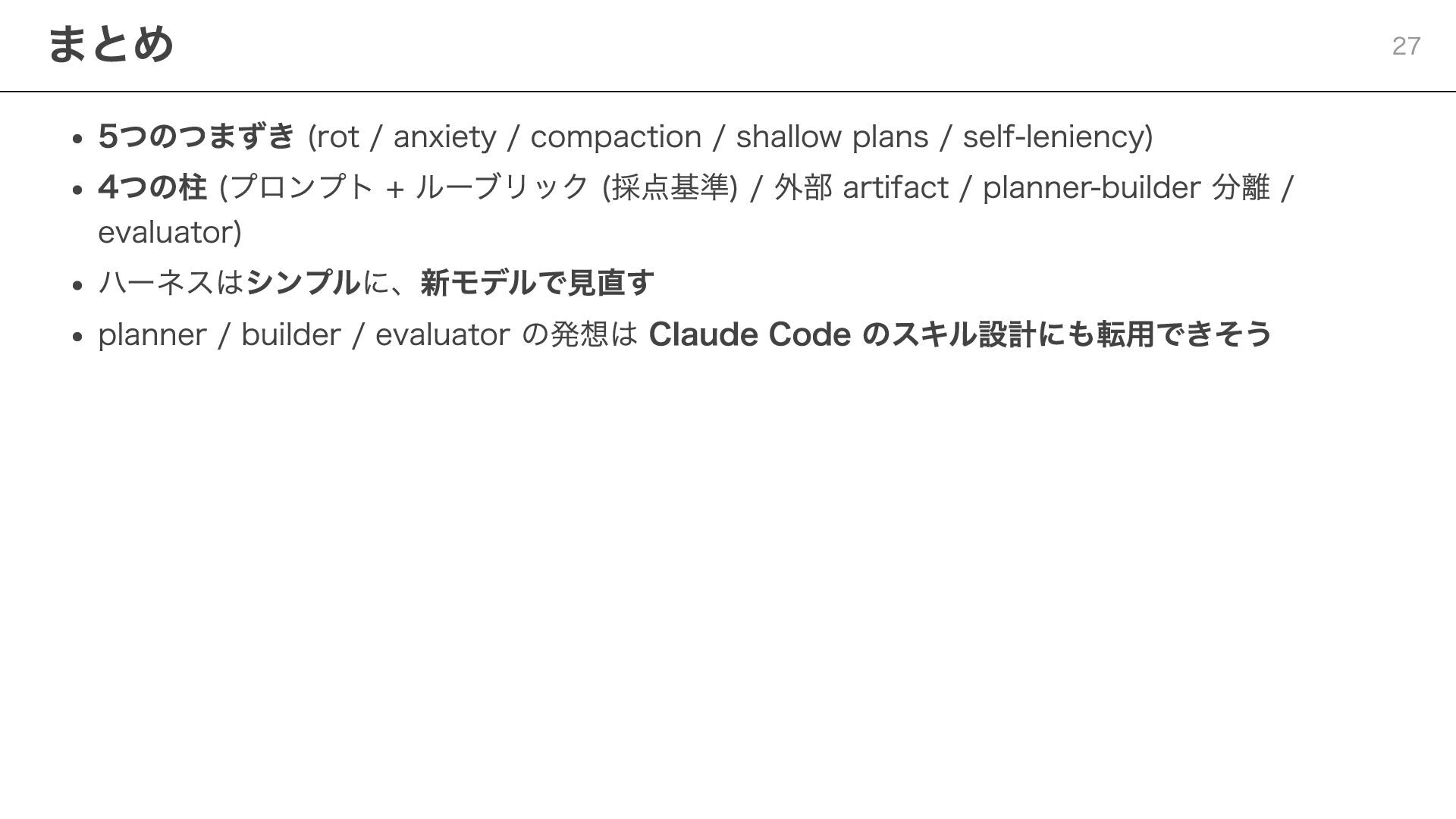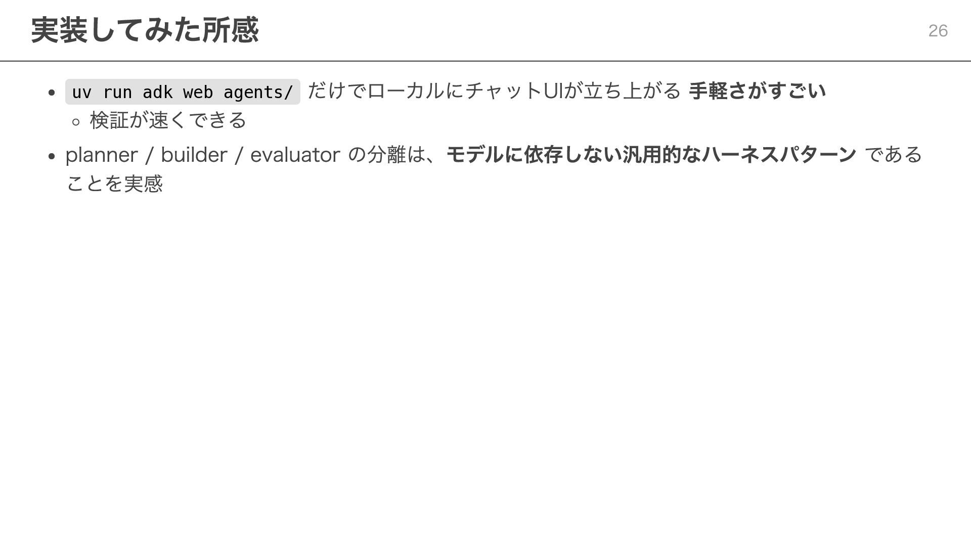 builder / evaluator の分離は、モデルに依存しない汎用的なハーネスパターン である ことを実感 実装してみた所感 26