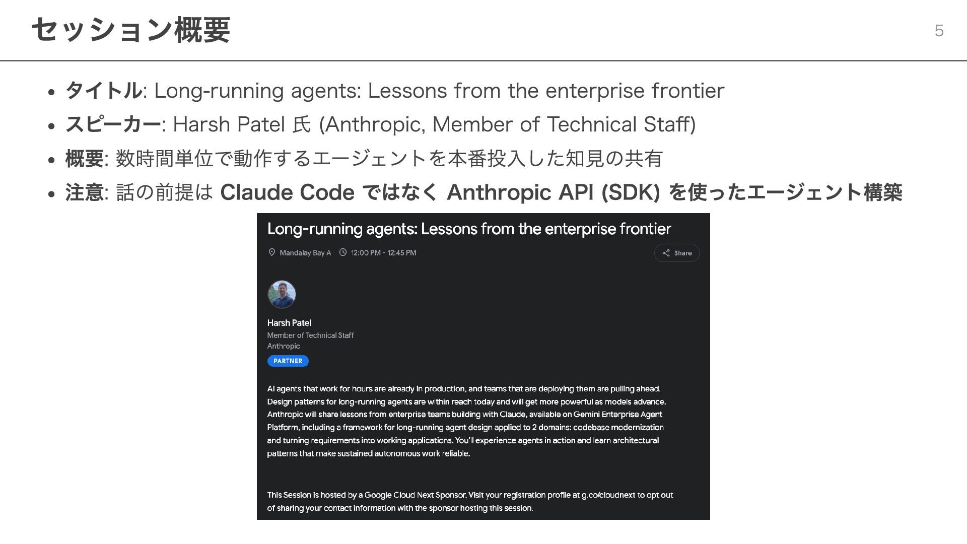 Patel 氏 (Anthropic, Member of Technical Staff) 概要: 数時間単位で動作するエージェントを本番投入した知見の共有 注意: 話の前提は Claude Code ではなく Anthropic API (SDK) を使ったエージェント構築 セッション概要 5