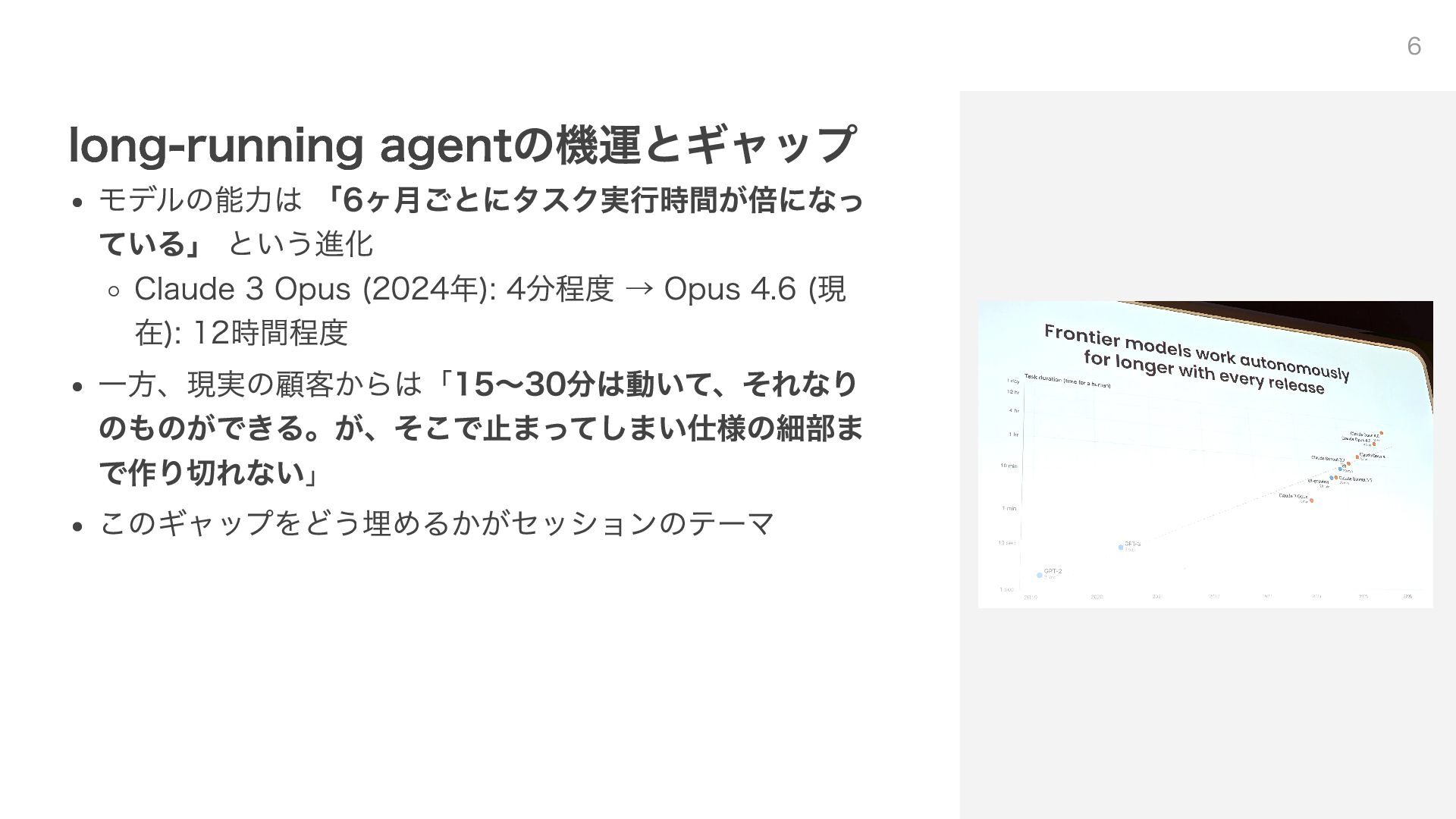 long-running agentの機運とギャップ モデルの能力は 「6ヶ月ごとにタスク実行時間が倍になっ ている」 という進化 Claude 3 Opus (2024年):