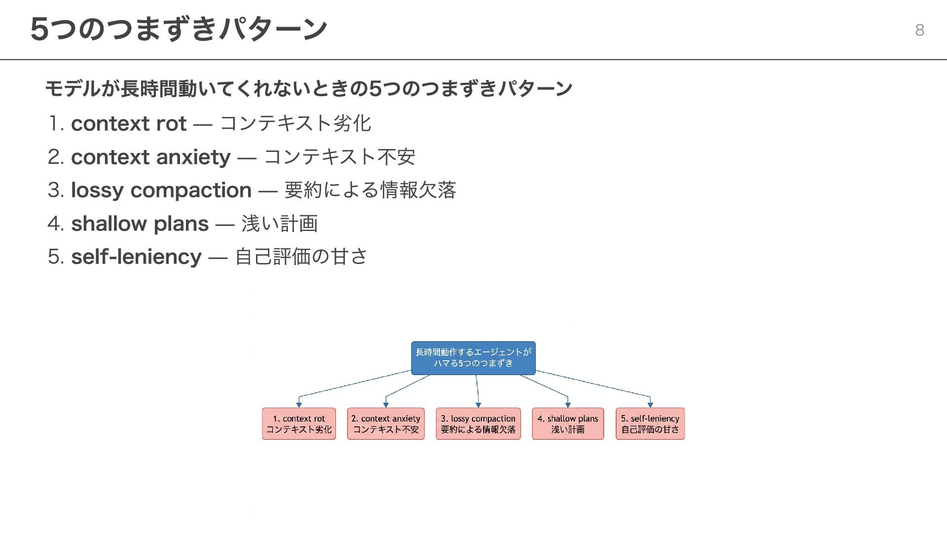 コンテキスト不安 3. lossy compaction — 要約による情報欠落 4. shallow plans — 浅い計画 5. self-leniency — 自己評価の甘さ 5つのつまずきパターン 8