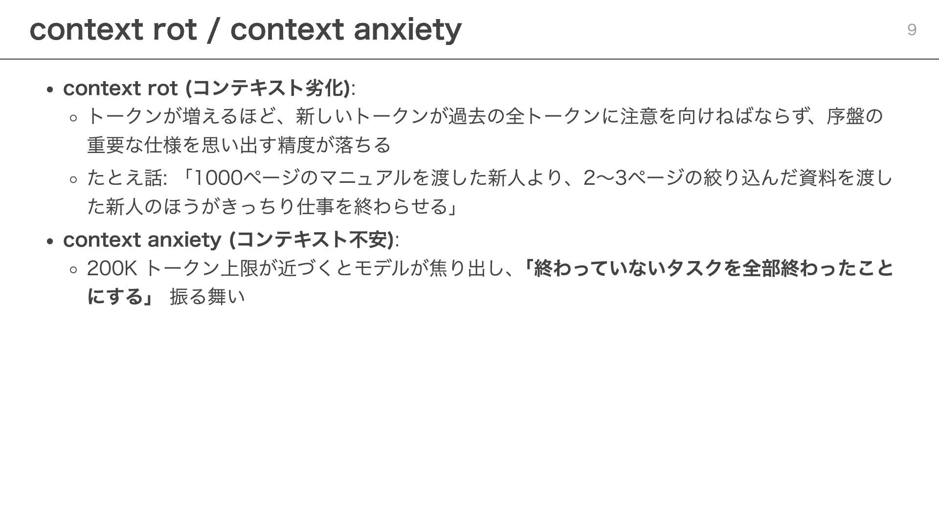 context rot (コンテキスト劣化): トークンが増えるほど、新しいトークンが過去の全トークンに注意を向けねばならず、序盤の 重要な仕様を思い出す精度が落ちる たとえ話: 「1000ページのマニュアルを渡した新人より、2〜3ページの絞り込んだ資料を渡し た新人のほうがきっちり仕事を終わらせる」 context anxiety