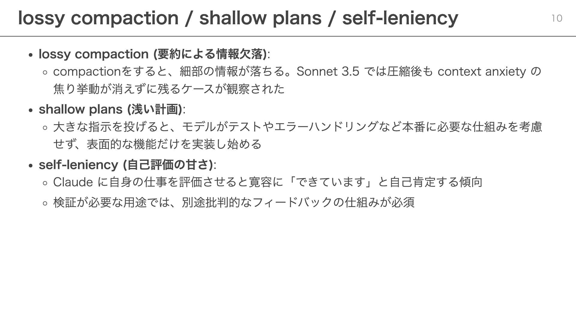 shallow plans (浅い計画): 大きな指示を投げると、モデルがテストやエラーハンドリングなど本番に必要な仕組みを考慮 せず、表面的な機能だけを実装し始める self-leniency (自己評価の甘さ): Claude に自身の仕事を評価させると寛容に「できています」と自己肯定する傾向 検証が必要な用途では、別途批判的なフィードバックの仕組みが必須 lossy compaction / shallow plans / self-leniency 10