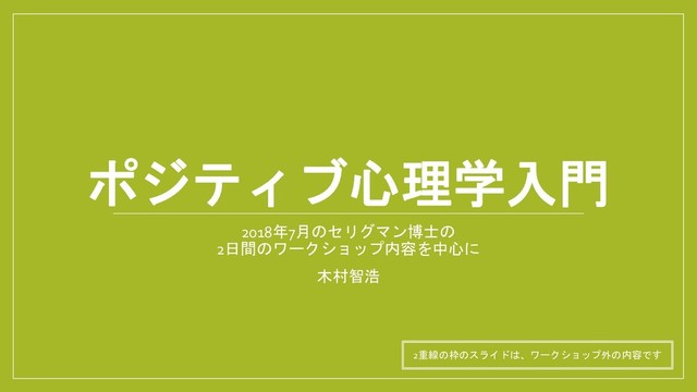 ポジティブ心理学入門 2018年7月のセリグマン博士の 2日間のワークショップ内容を中心に 木村智浩 2重線の枠のスライドは、ワークショップ外の内容です