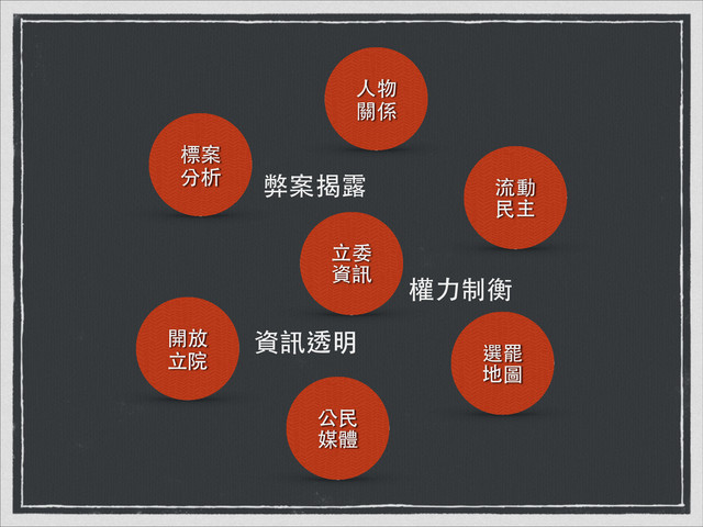 流動 ⺠民主 選罷 地圖 弊案揭露 權⼒力制衡 資訊透明