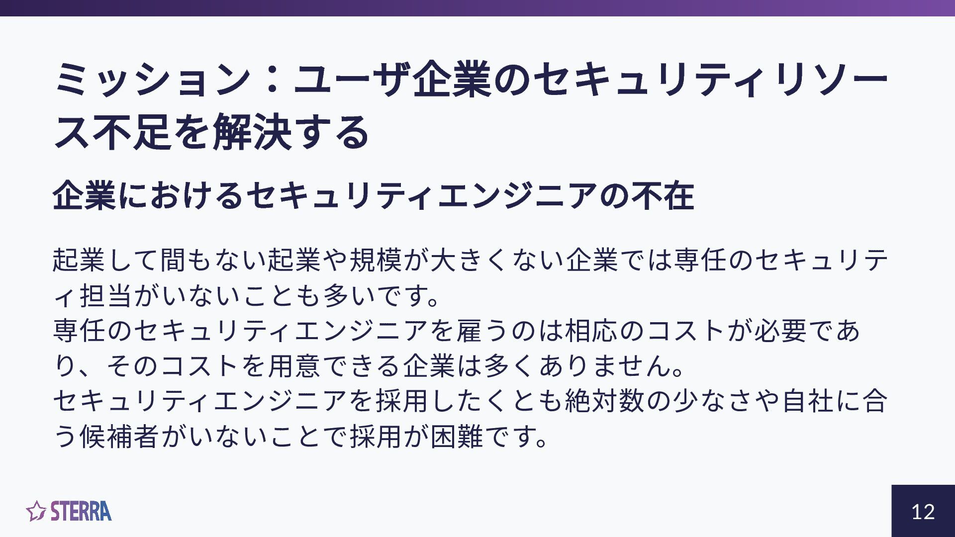 ミッション:ユーザ企業のセキュリティリソー ス不足を解決する 企業におけるセキュリティエンジニアの不在 起業して間もない起業や規模が大きくない企業では専任のセキュリテ ィ担当がいないことも多いです。 専任のセキュリティエンジニアを雇うのは相応のコストが必要であ り、そのコストを用意できる企業は多くありません。 セキュリティエンジニアを採用したくとも絶対数の少なさや自社に合 う候補者がいないことで採用が困難です。 12