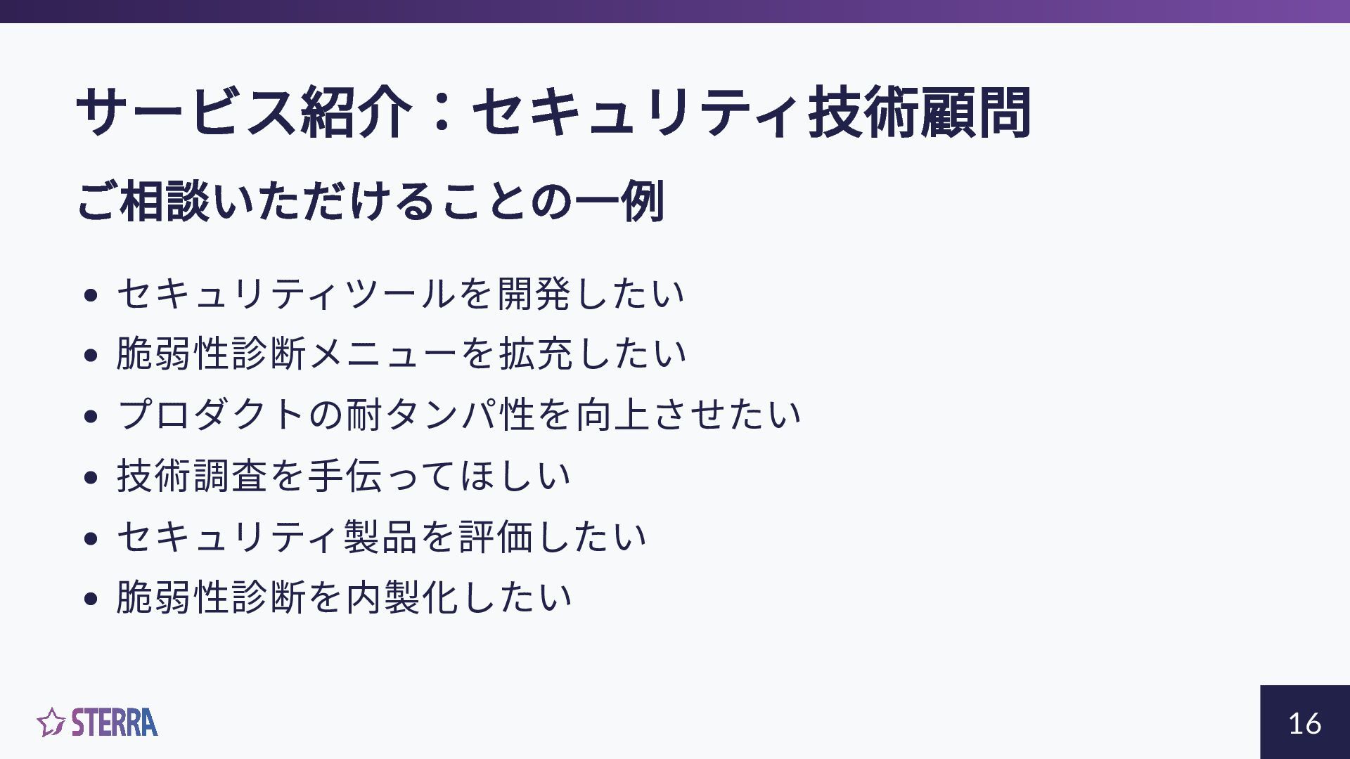サービス紹介:セキュリティ技術顧問 「社内にセキュリティの専門家がいない」 「ツールを開発したいが知 識が不足している」企業様に向けたセキュリティ技術課題を解決に導 くサービスです。 豊富な実績と経験を持つ代表の小竹がお客様と並走し、お抱えの課題 の解決を支援致します。セキュリティベンダの方にも、ご利用いただ けます。 15