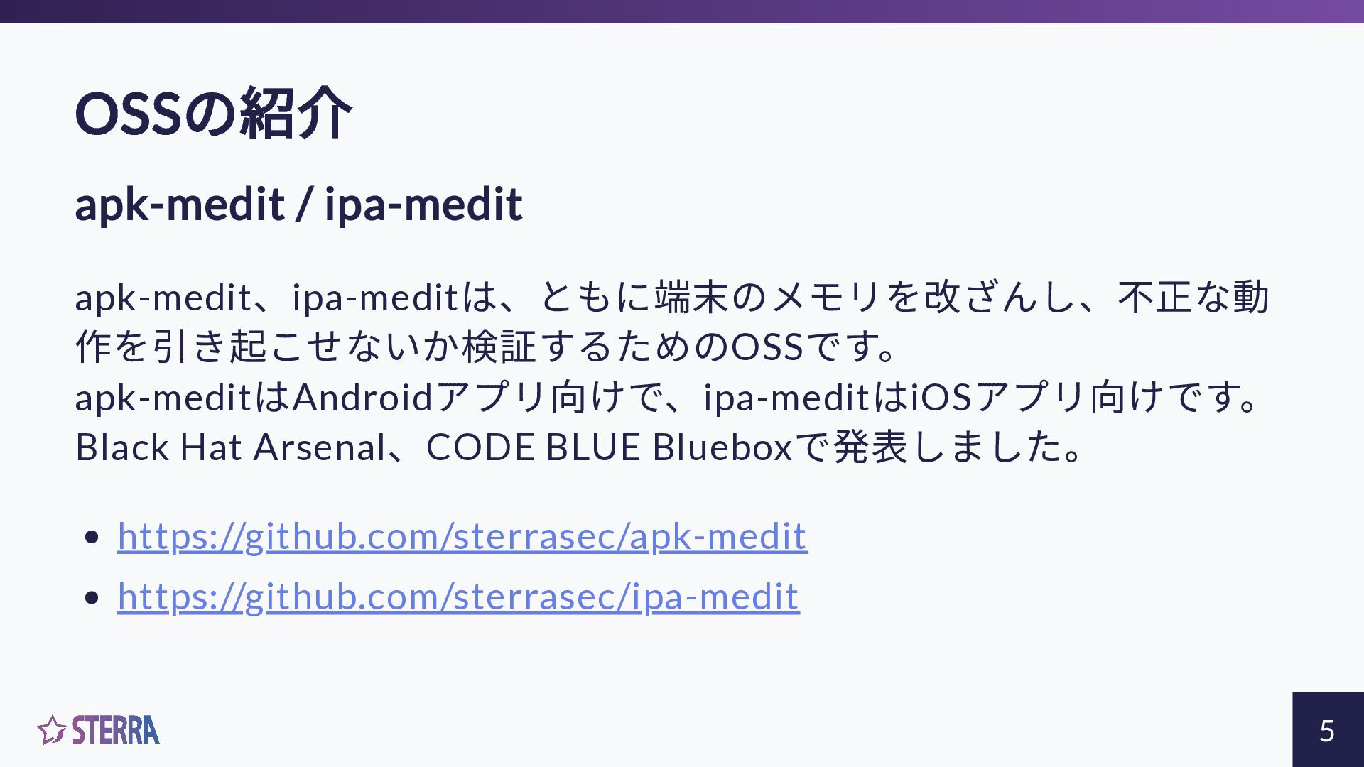 Arsenal、CODE BLUE Blueboxで発表しました。 https://github.com/sterrasec/apk-medit https://github.com/sterrasec/ipa-medit 5