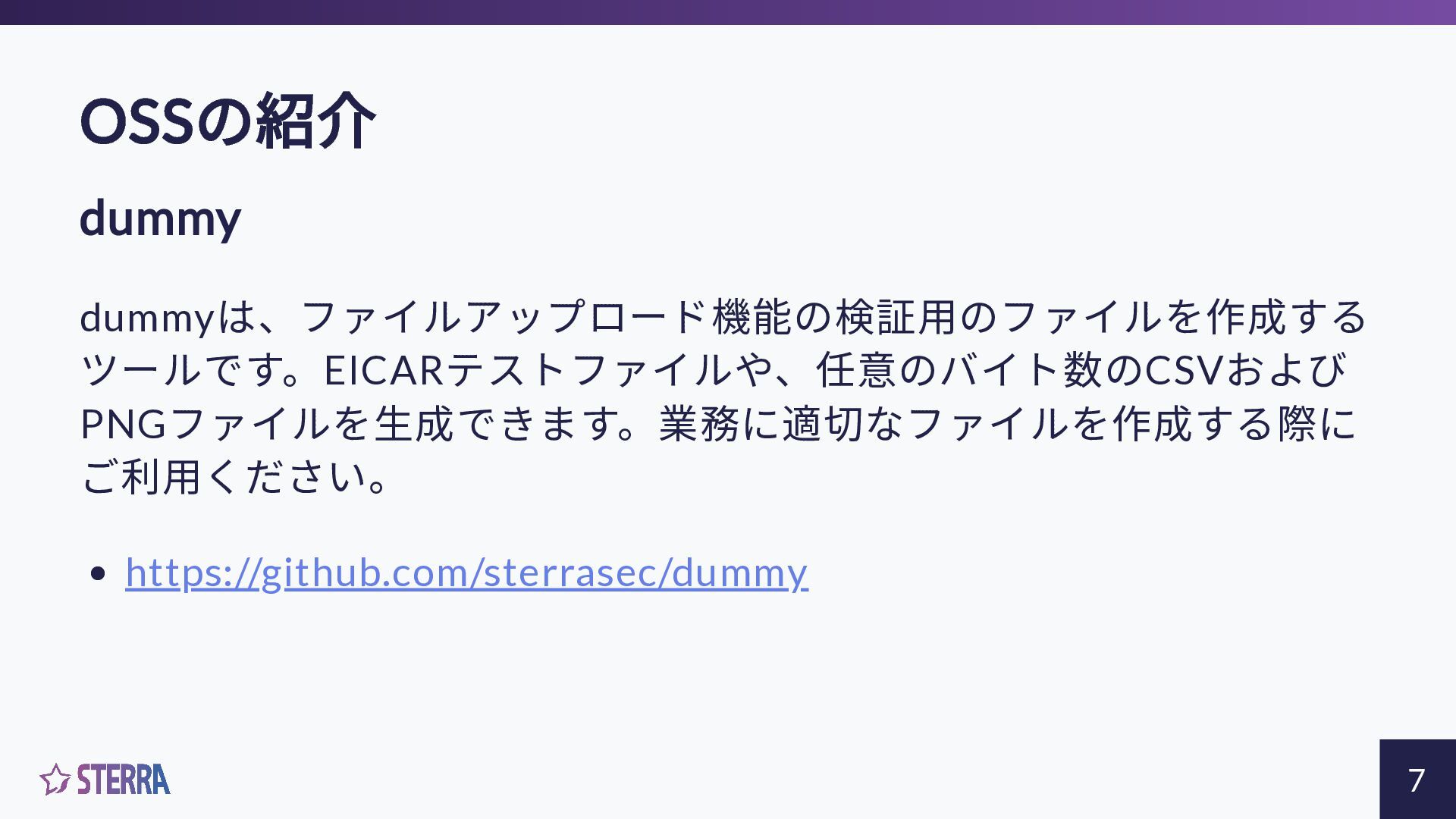 OSS の紹介 dummy dummyは、ファイルアップロード機能の検証用のファイルを作成する ツールです。EICARテストファイルや、任意のバイト数のCSVおよび PNGファイルを生成できます。業務に適切なファイルを作成する際に ご利用ください。 https://github.com/sterrasec/dummy 7