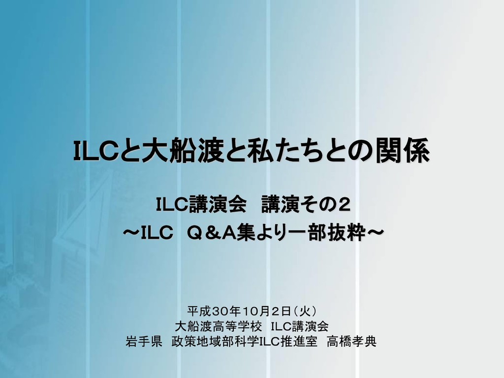 ILCと大船渡と私たちとの関係 ILC講演会 講演その2 ~ILC Q&A集より一部抜粋~ 平成30年10月2日(火) 大船渡高等学校 ILC講演会 岩手県 政策地域部科学ILC推進室
