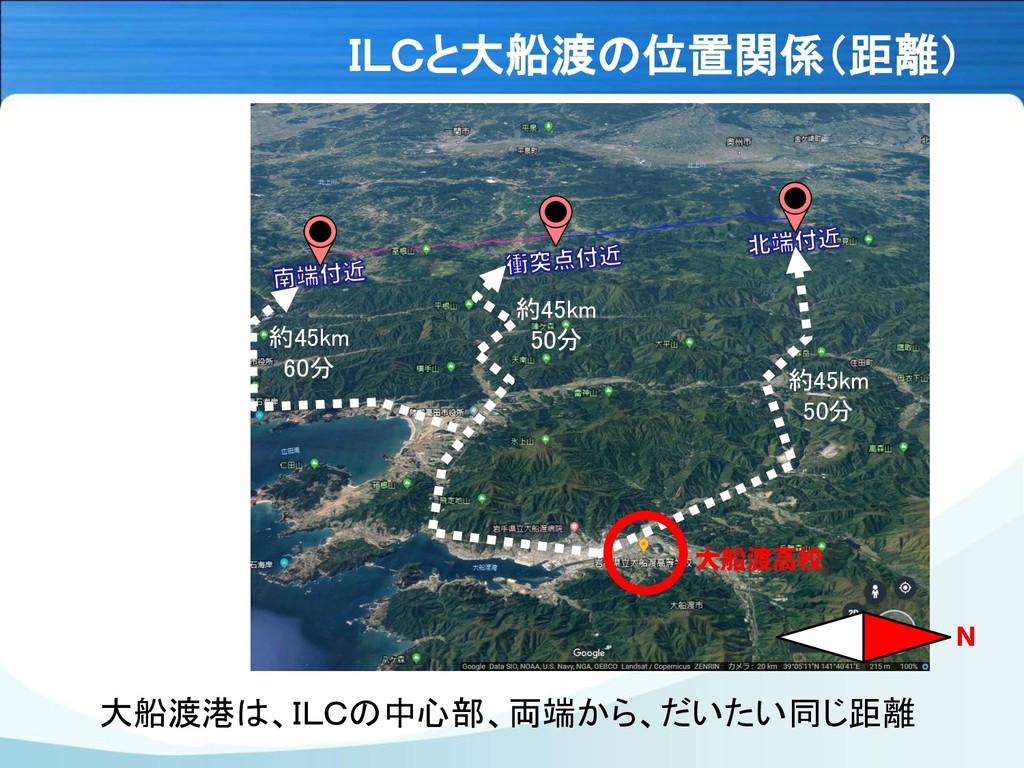 ILCと大船渡の位置関係(距離) 約45km 50分 約45km 50分 約45km 60分 大船渡港は、ILCの中心部、両端から、だいたい同じ距離
