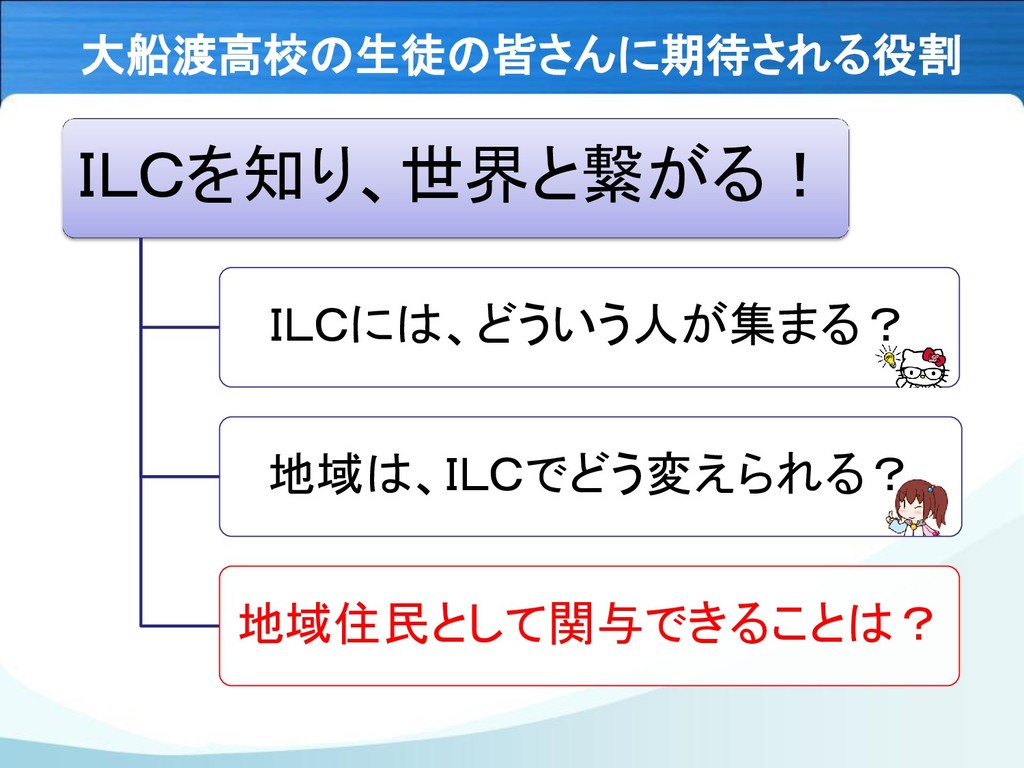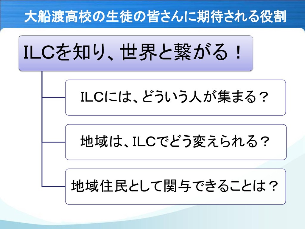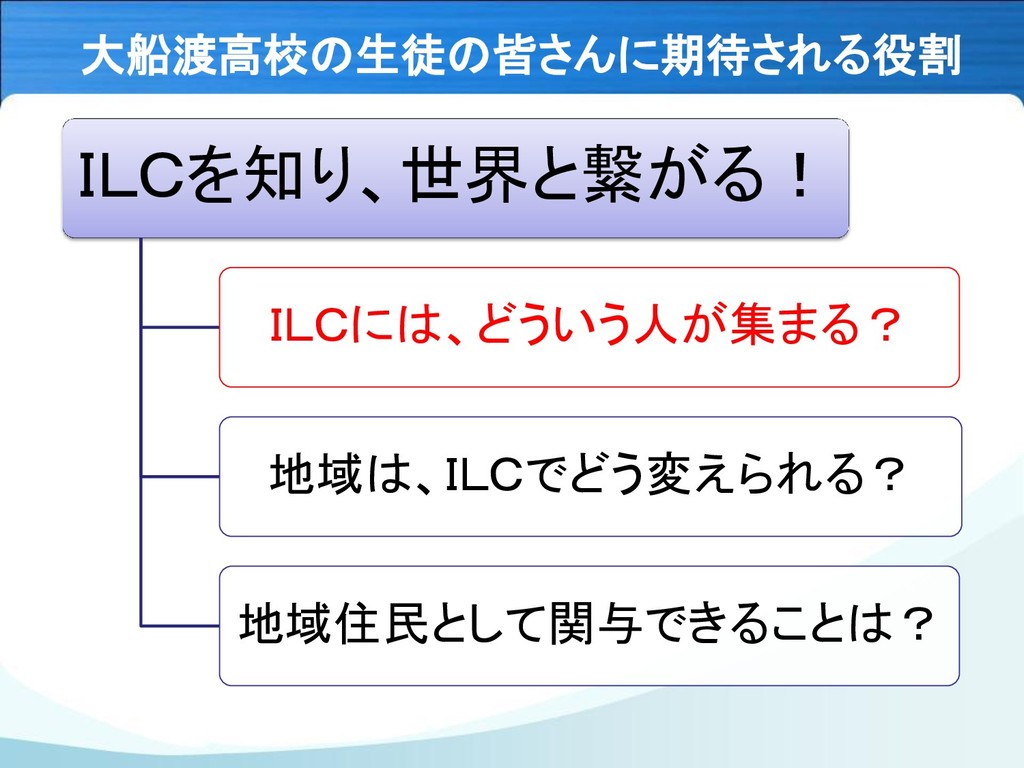 大船渡高校の生徒の皆さんに期待される役割 ILCを知り、世界と繋がる! ILCには、どういう人が集まる? 地域は、ILCでどう変えられる? 地域住民として関与できることは?