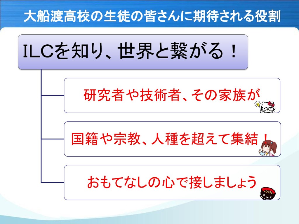 大船渡高校の生徒の皆さんに期待される役割 ILCを知り、世界と繋がる! 研究者や技術者、その家族が 国籍や宗教、人種を超えて集結! おもてなしの心で接しましょう