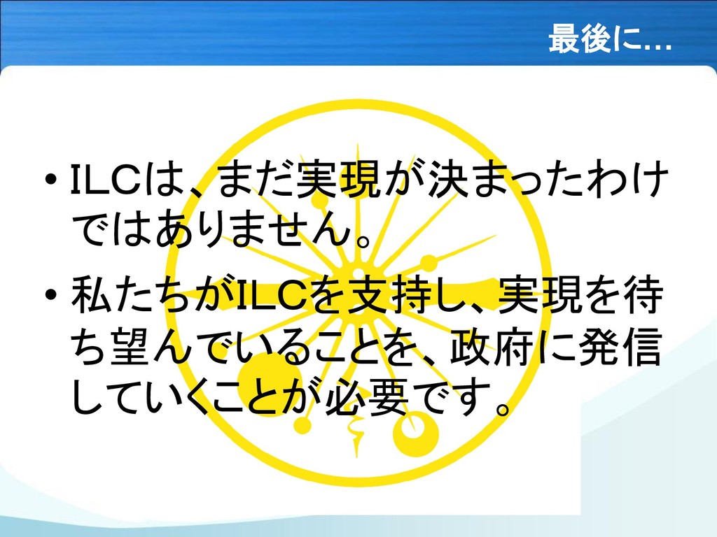 最後に… • ILCは、まだ実現が決まったわけ ではありません。 • 私たちがILCを支持し、実現を待 ち望んでいることを、政府に発信 していくことが必要です。
