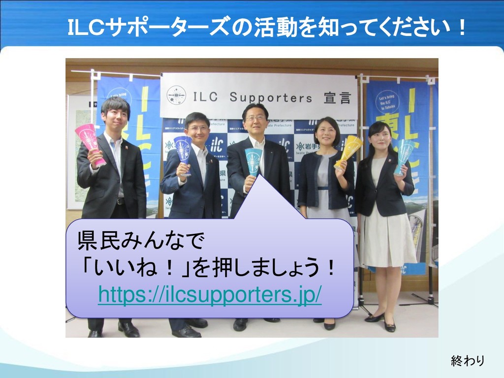 ILCサポーターズの活動を知ってください! 県民みんなで 「いいね!」を押しましょう! https://ilcsupporters.jp/ 終わり