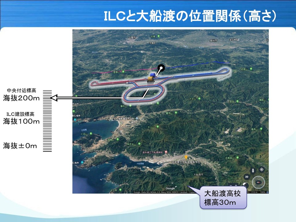 ILCと大船渡の位置関係(高さ) 海抜200m 海抜100m 海抜±0m 中央付近標高 大船渡高校 標高30m ILC建設標高