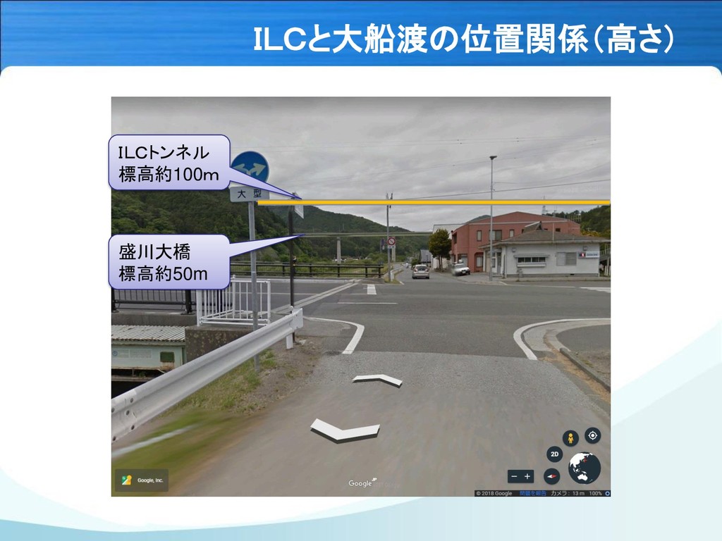 ILCと大船渡の位置関係(高さ) 盛川大橋 標高約50m ILCトンネル 標高約100m
