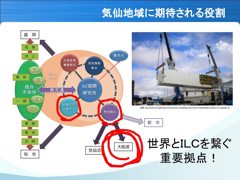 気仙地域に期待される役割 出典:http://www.eti-ingenierie.fr/fr/structure-metallique/structures-industrielles/cold-box-air-liquide,76/ 世界とILCを繋ぐ 重要拠点!