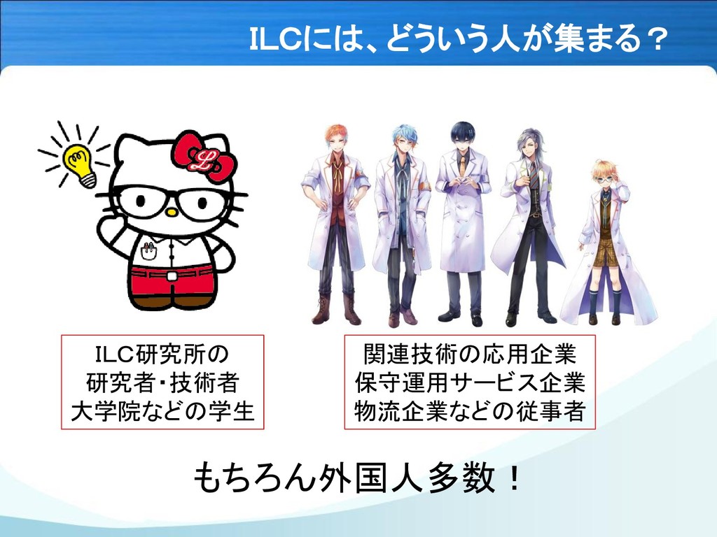 ILCには、どういう人が集まる? ILC研究所の 研究者・技術者 大学院などの学生 関連技術の応用企業 保守運用サービス企業 物流企業などの従事者 もちろん外国人多数!