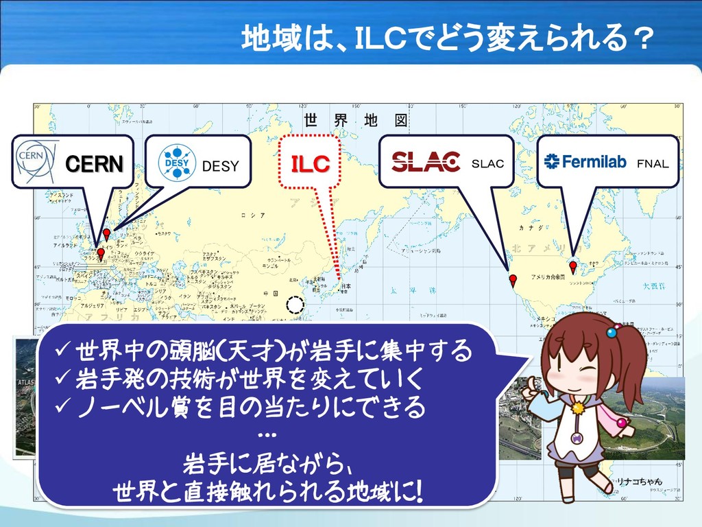 地域は、ILCでどう変えられる? DESY CERN ILC SLAC FNAL 世界中の頭脳(天才)が岩手に集中する 岩手発の技術が世界を変えていく