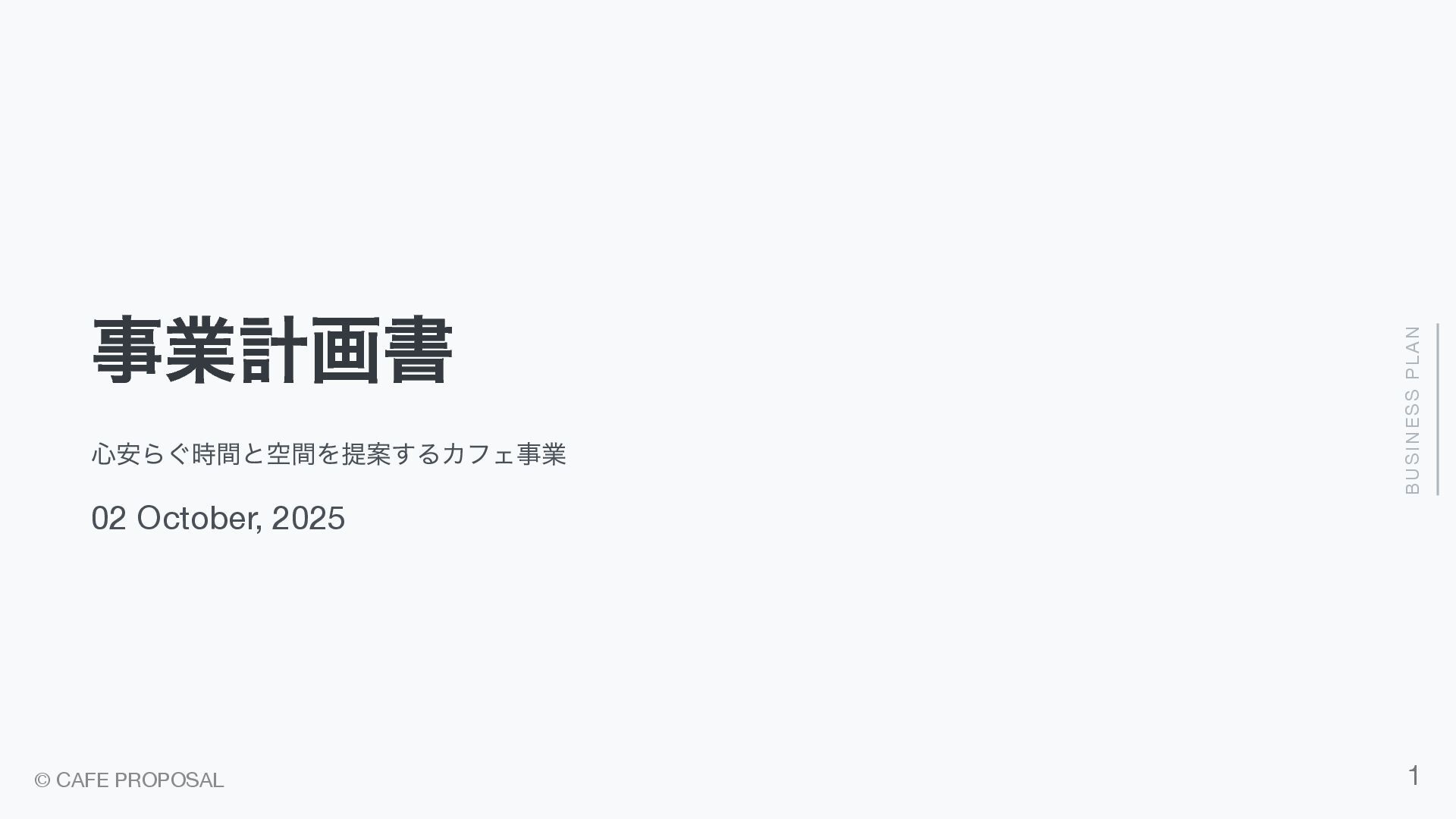 事業計画書 心安らぐ時間と空間を提案するカフェ事業 02 October, 2025 BUSINESS PLAN © CAFE PROPOSAL