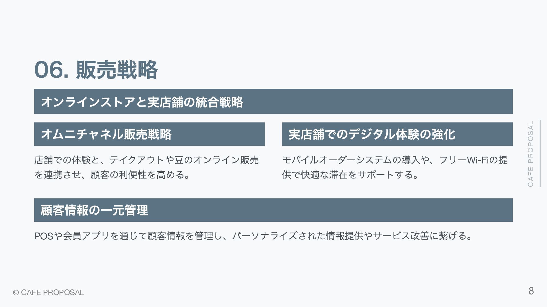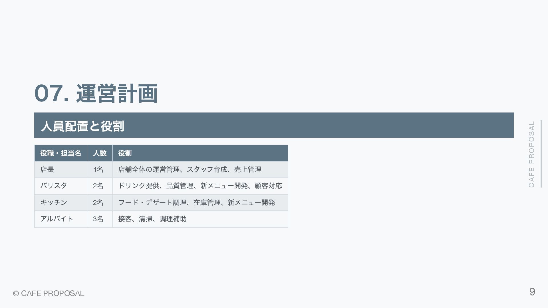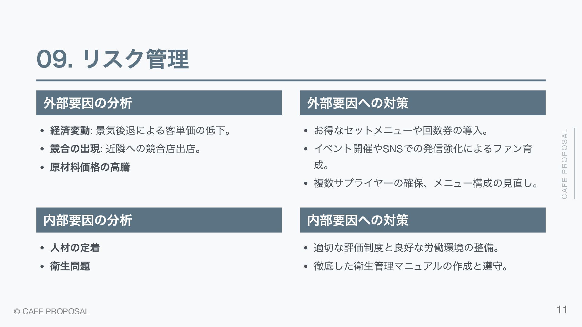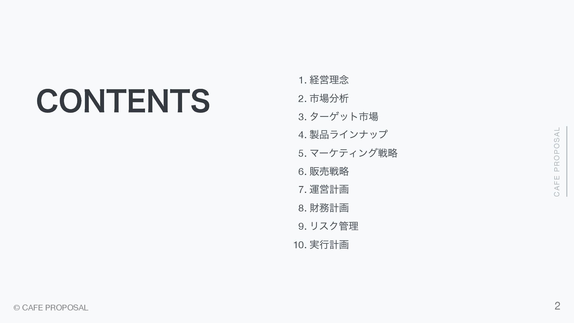 マーケティング戦略 6. 販売戦略 7. 運営計画 8. 財務計画 9. リスク管理 10. 実行計画 CAFE PROPOSAL © CAFE PROPOSAL 2