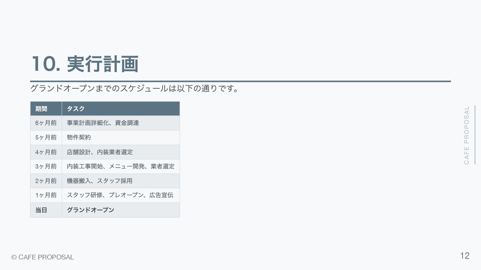 10. 実行計画 グランドオープンまでのスケジュールは以下の通りです。 期間 タスク 6 ヶ月前 事業計画詳細化、資金調達 5 ヶ月前