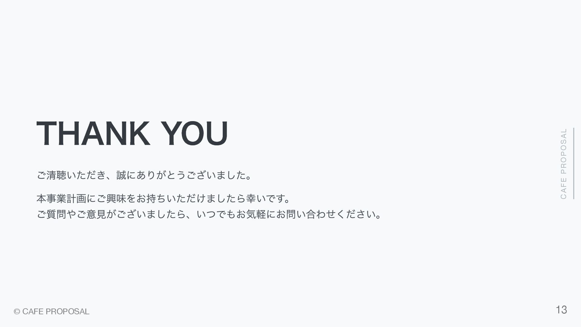 THANK YOU ご清聴いただき、誠にありがとうございました。 本事業計画にご興味をお持ちいただけましたら幸いです。 ご質問やご意見がございましたら、いつでもお気軽にお問い合わせください。 CAFE PROPOSAL © CAFE PROPOSAL