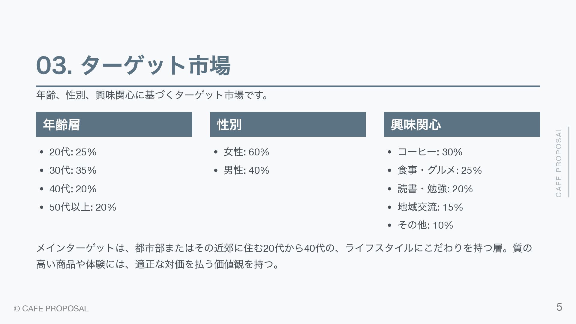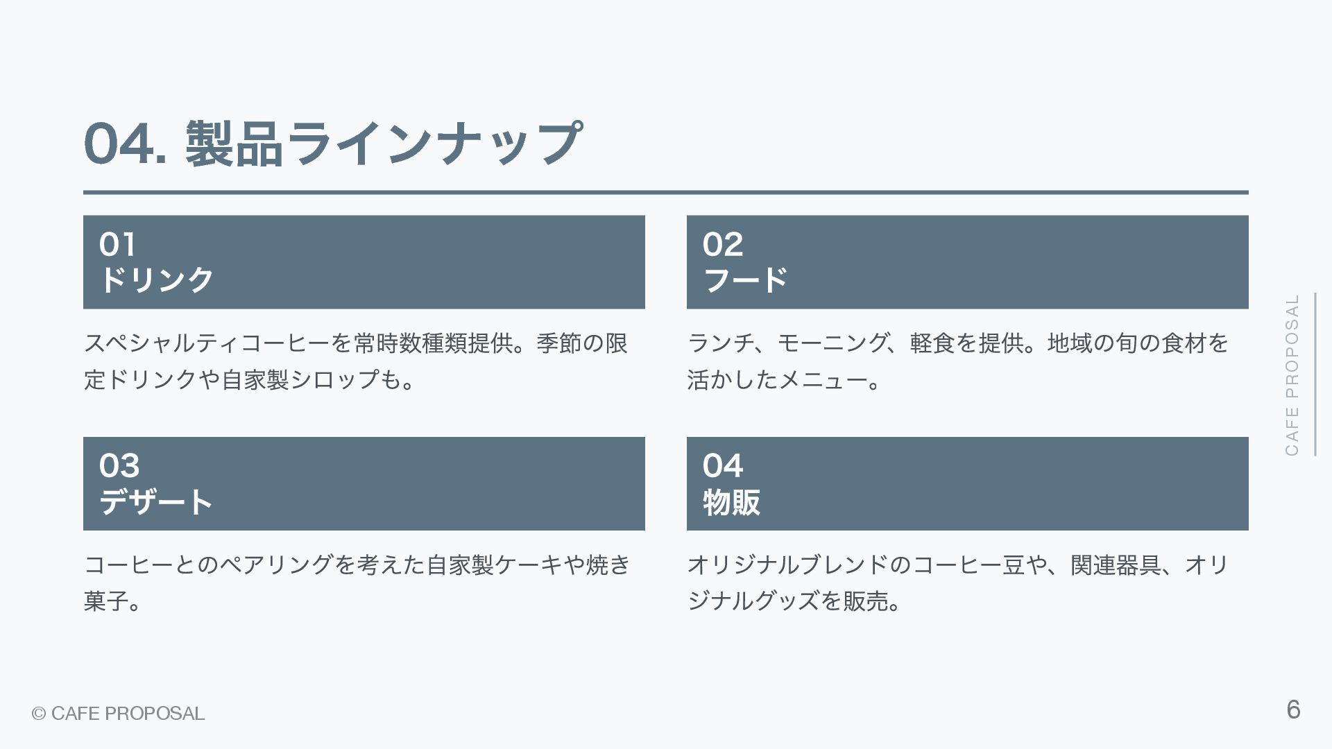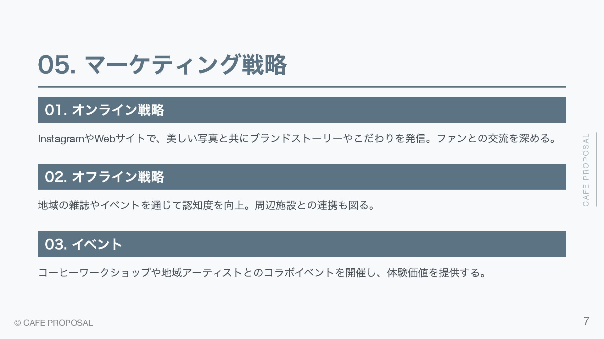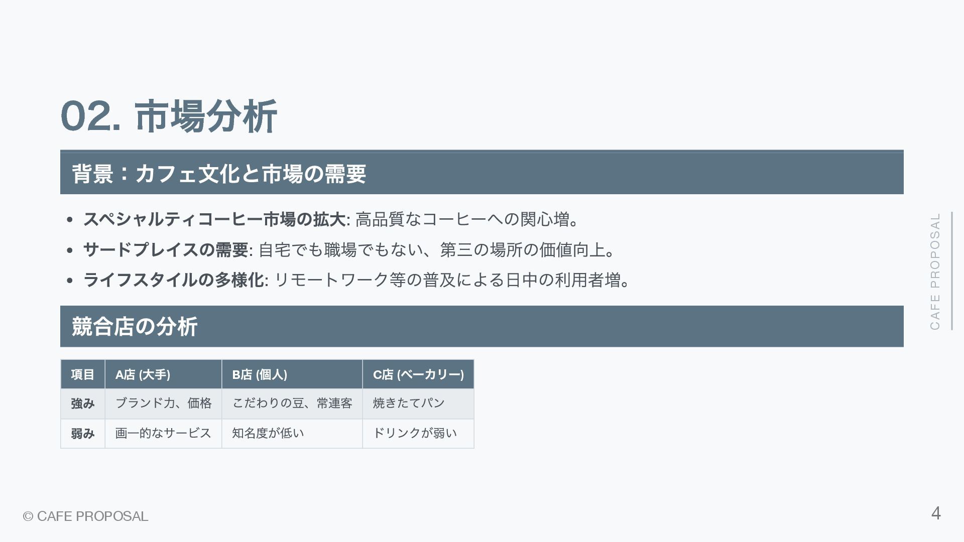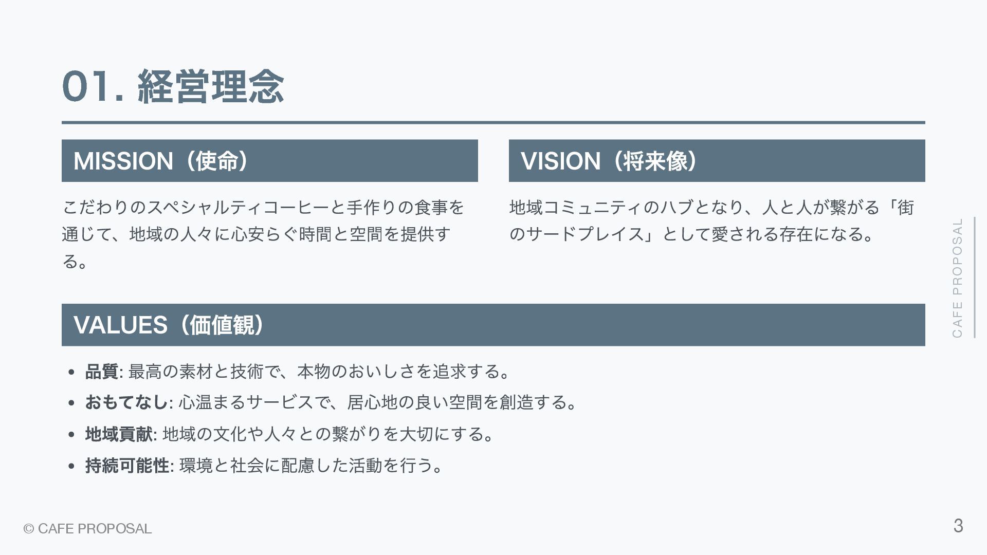 品質: 最高の素材と技術で、本物のおいしさを追求する。 おもてなし: 心温まるサービスで、居心地の良い空間を創造する。 地域貢献: 地域の文化や人々との繋がりを大切にする。 持続可能性: 環境と社会に配慮した活動を行う。 CAFE PROPOSAL © CAFE PROPOSAL 3