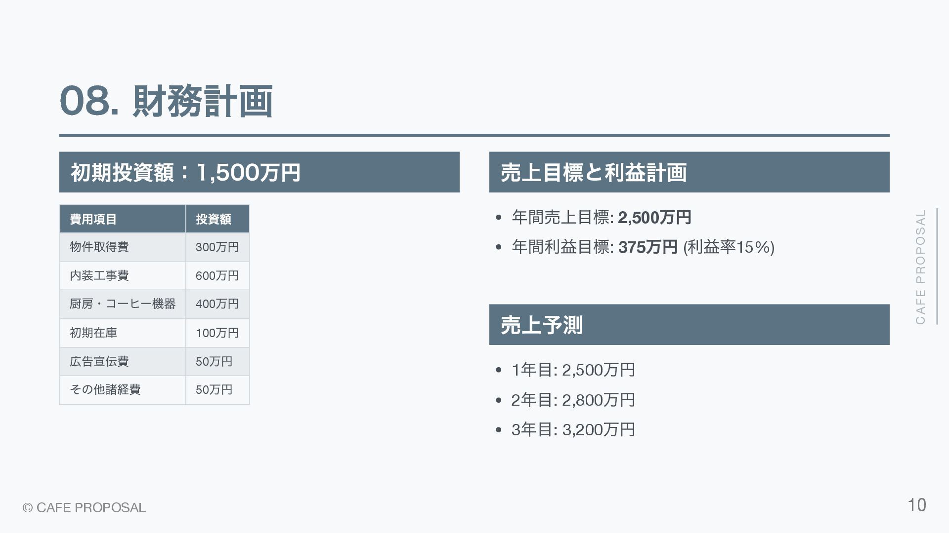 万円 厨房・コーヒー機器 400 万円 初期在庫 100 万円 広告宣伝費 50 万円 その他諸経費 50 万円 売上目標と利益計画 年間売上目標: 2,500 万円 年間利益目標: 375 万円 ( 利益率15%) 売上予測 1 年目: 2,500 万円 2 年目: 2,800 万円 3 年目: 3,200 万円 CAFE PROPOSAL © CAFE PROPOSAL 10