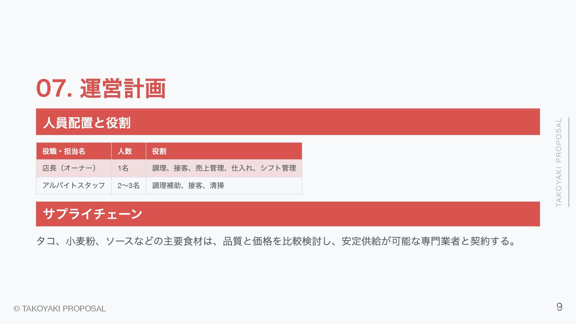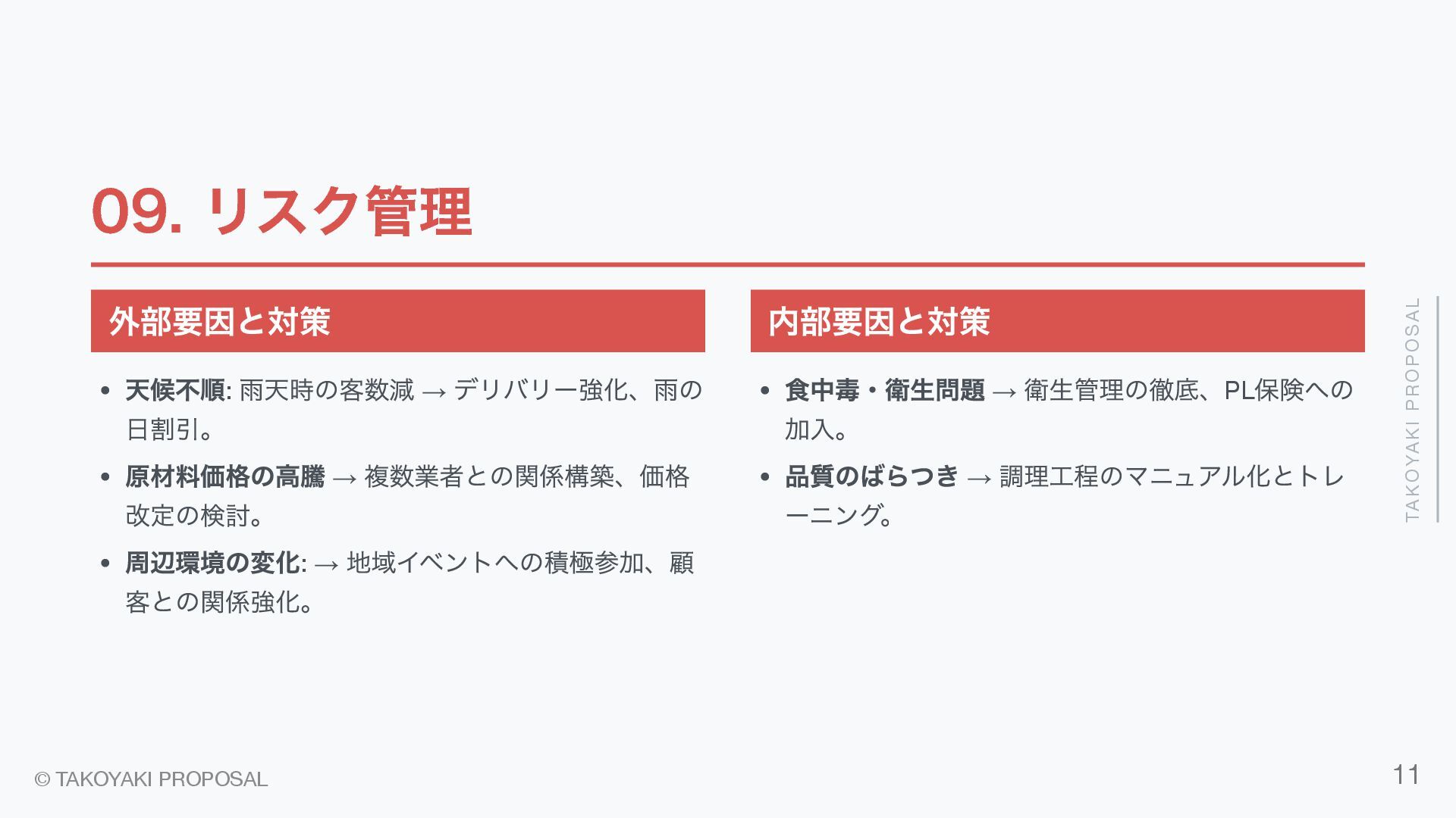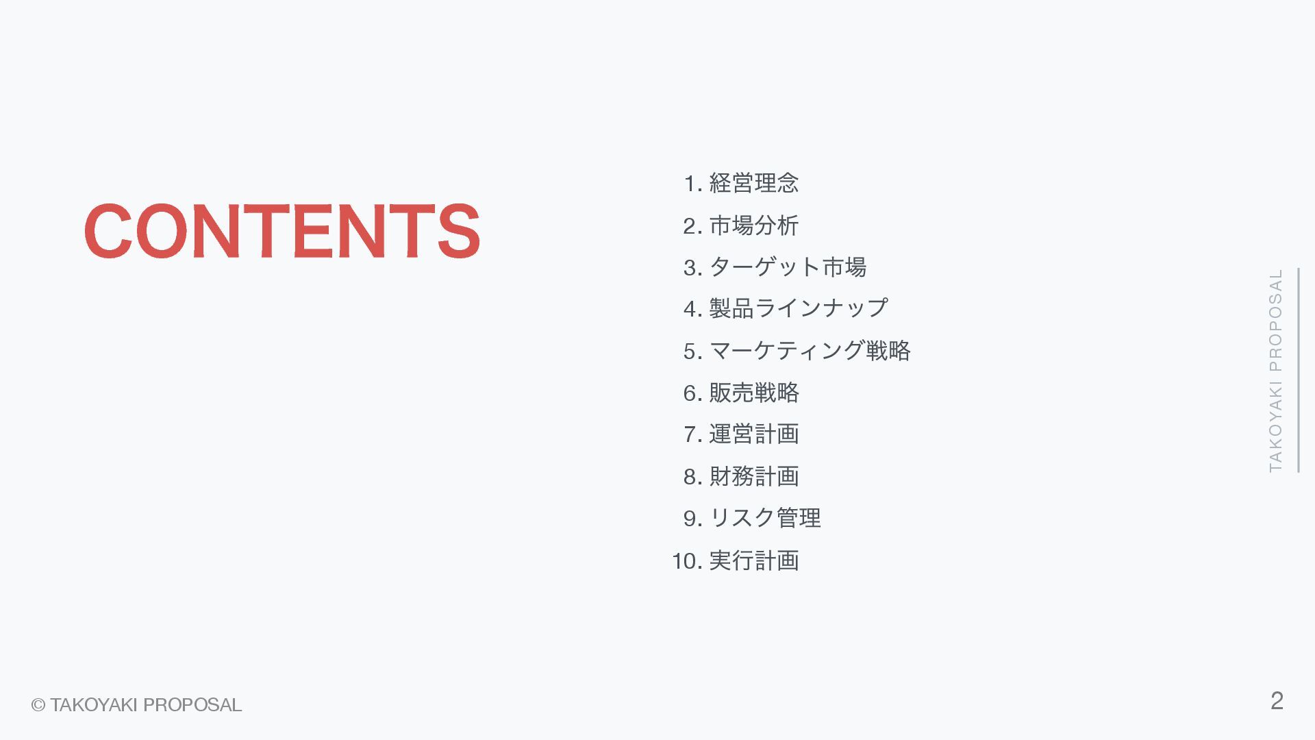 マーケティング戦略 6. 販売戦略 7. 運営計画 8. 財務計画 9. リスク管理 10. 実行計画 TAKOYAKI PROPOSAL © TAKOYAKI PROPOSAL 2