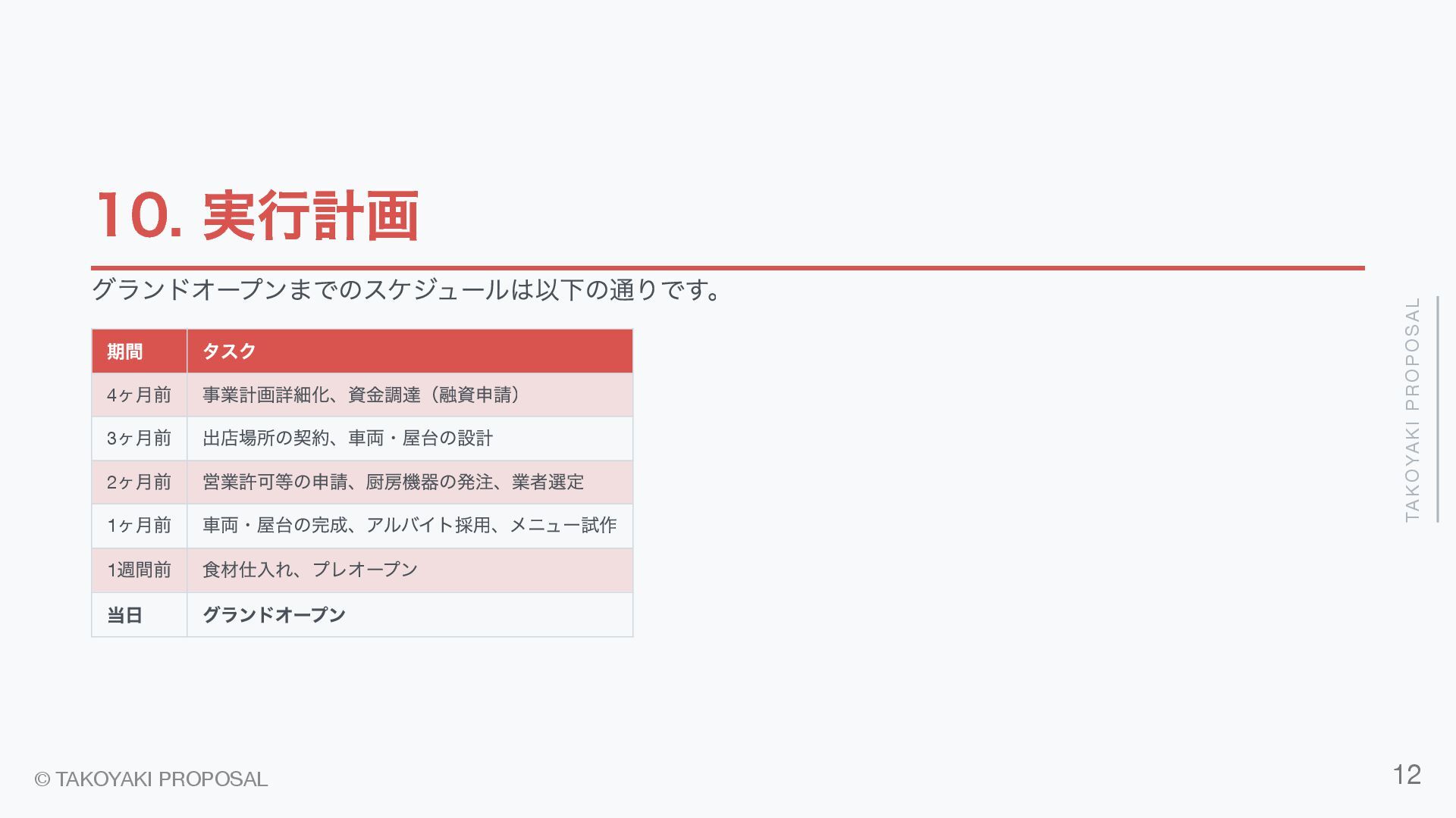 10. 実行計画 グランドオープンまでのスケジュールは以下の通りです。 期間 タスク 4 ヶ月前 事業計画詳細化、資金調達(融資申請) 3 ヶ月前