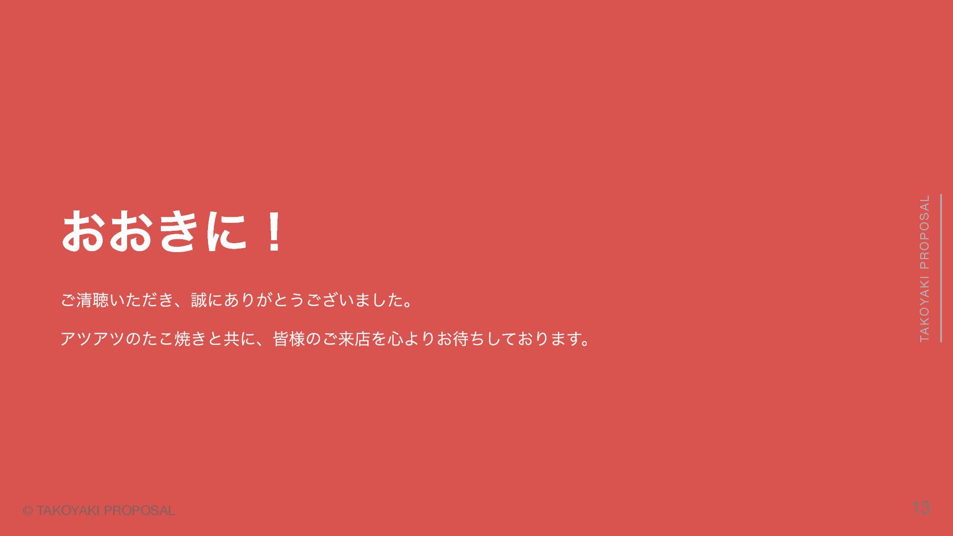 おおきに! ご清聴いただき、誠にありがとうございました。 アツアツのたこ焼きと共に、皆様のご来店を心よりお待ちしております。 TAKOYAKI PROPOSAL © TAKOYAKI PROPOSAL 13