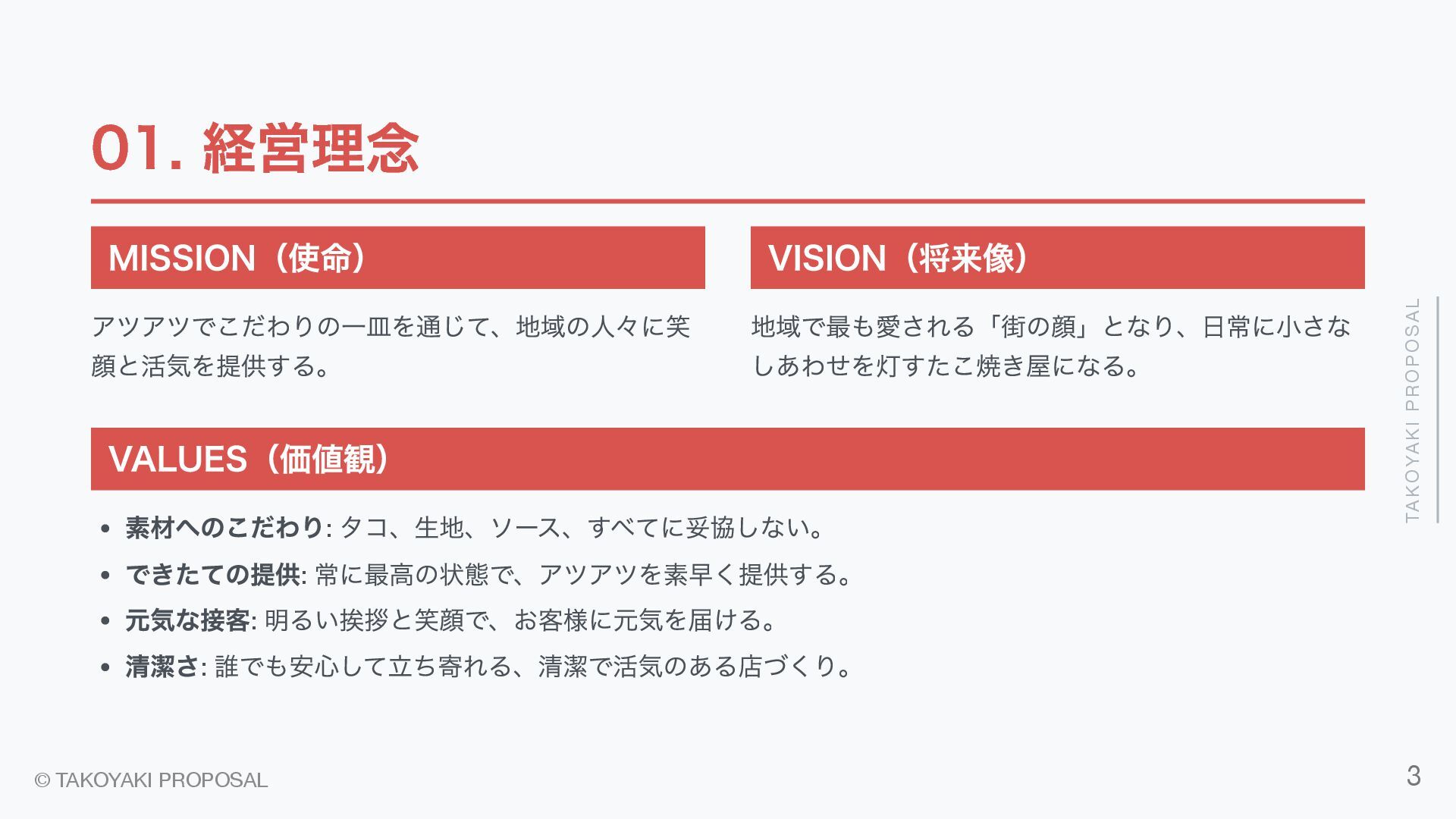 01. 経営理念 MISSION(使命) アツアツでこだわりの一皿を通じて、地域の人々に笑 顔と活気を提供する。 VISION(将来像) 地域で最も愛される「街の顔」となり、日常に小さな しあわせを灯すたこ焼き屋になる。 VALUES(価値観) 素材へのこだわり: