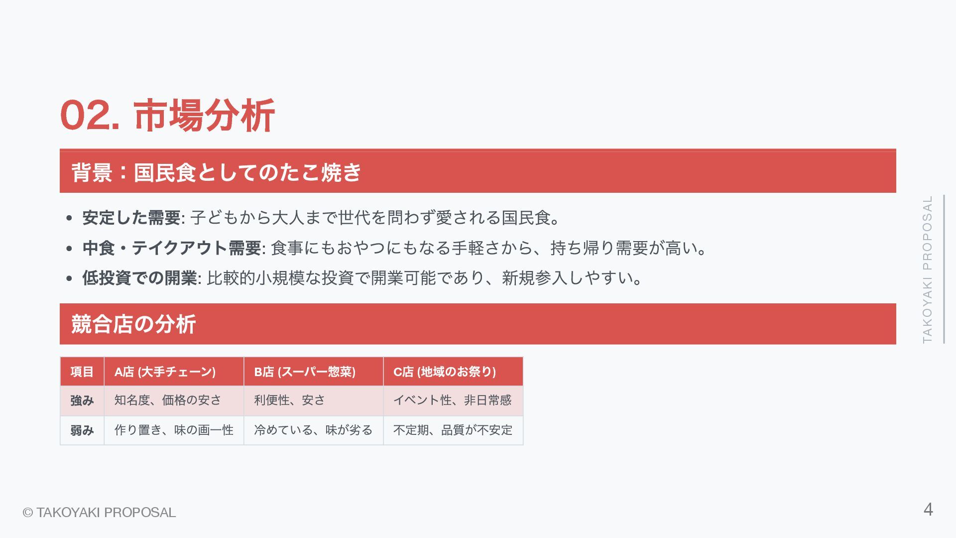02. 市場分析 背景:国民食としてのたこ焼き 安定した需要: 子どもから大人まで世代を問わず愛される国民食。 中食・テイクアウト需要: 食事にもおやつにもなる手軽さから、持ち帰り需要が高い。 低投資での開業: 比較的小規模な投資で開業可能であり、新規参入しやすい。 競合店の分析