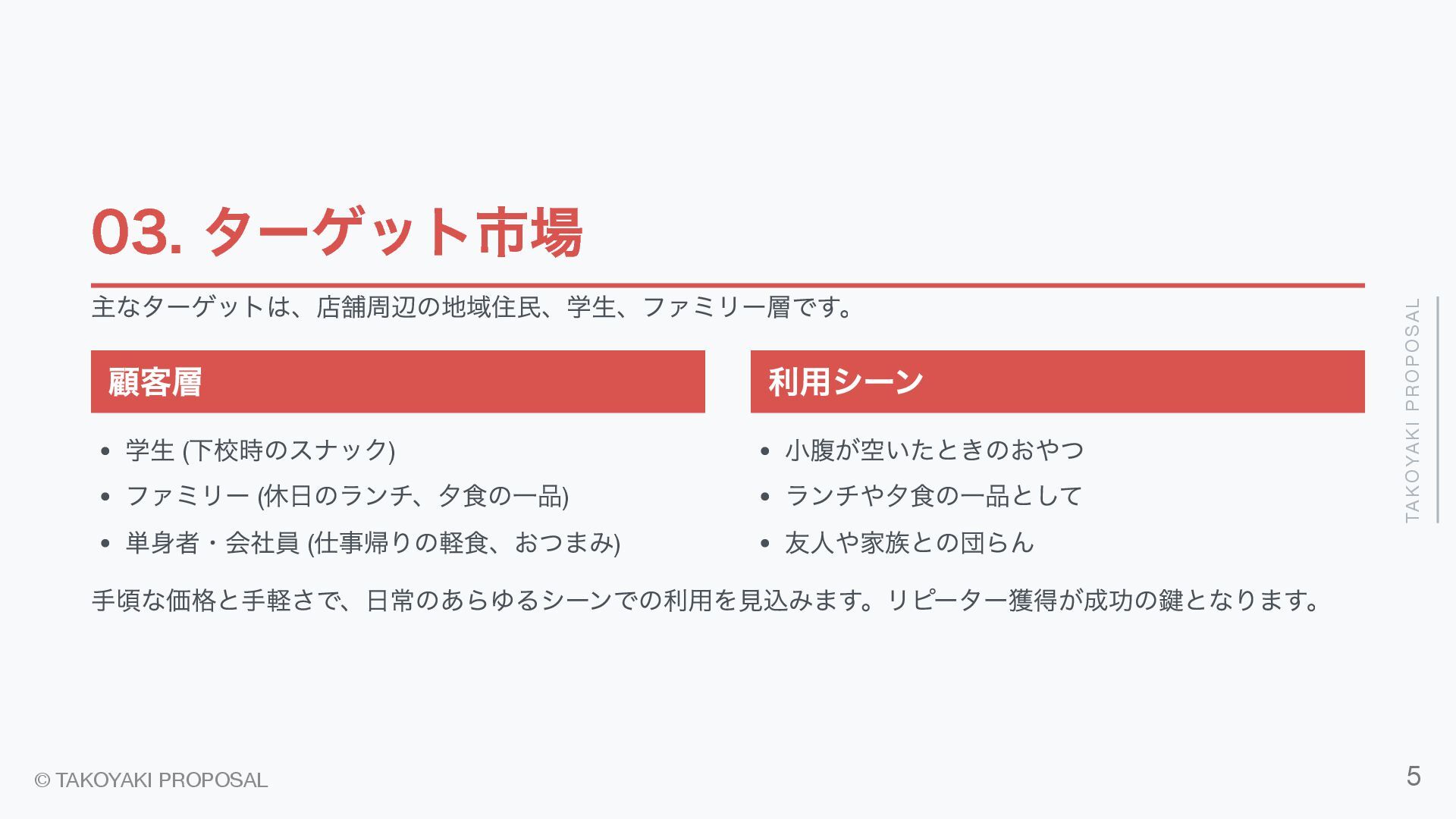 項目 A 店 ( 大手チェーン) B 店 ( スーパー惣菜) C 店 ( 地域のお祭り) 強み 知名度、価格の安さ 利便性、安さ イベント性、非日常感 弱み 作り置き、味の画一性 冷めている、味が劣る 不定期、品質が不安定 TAKOYAKI PROPOSAL © TAKOYAKI PROPOSAL 4