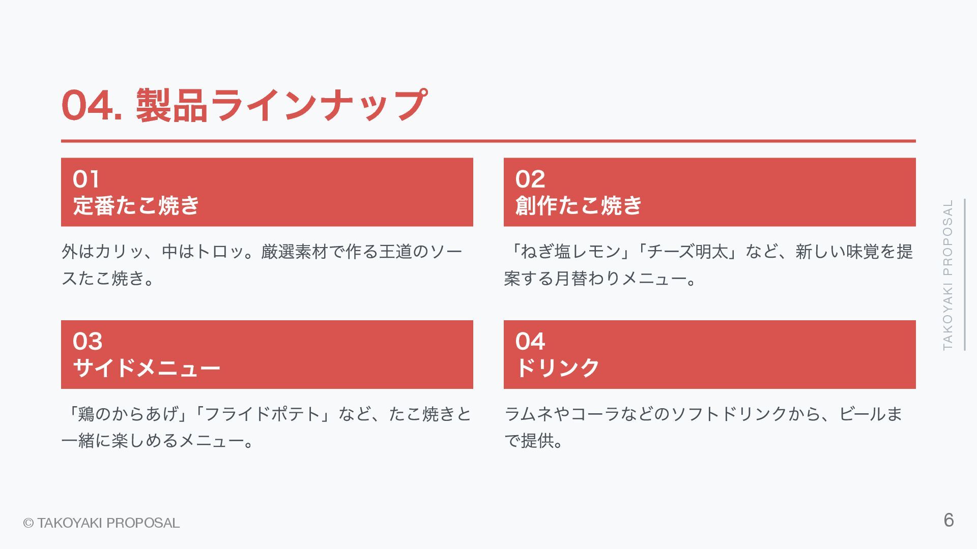 案する月替わりメニュー。 03 サイドメニュー 「鶏のからあげ」 「フライドポテト」など、たこ焼きと 一緒に楽しめるメニュー。 04 ドリンク ラムネやコーラなどのソフトドリンクから、ビールま で提供。 TAKOYAKI PROPOSAL © TAKOYAKI PROPOSAL 6