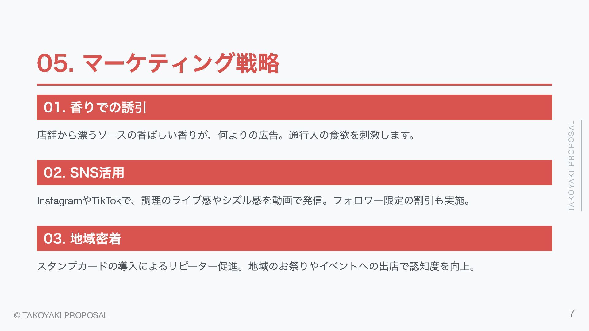 05. マーケティング戦略 01. 香りでの誘引 店舗から漂うソースの香ばしい香りが、何よりの広告。通行人の食欲を刺激します。 02. SNS活用 Instagram やTikTok で、調理のライブ感やシズル感を動画で発信。フォロワー限定の割引も実施。