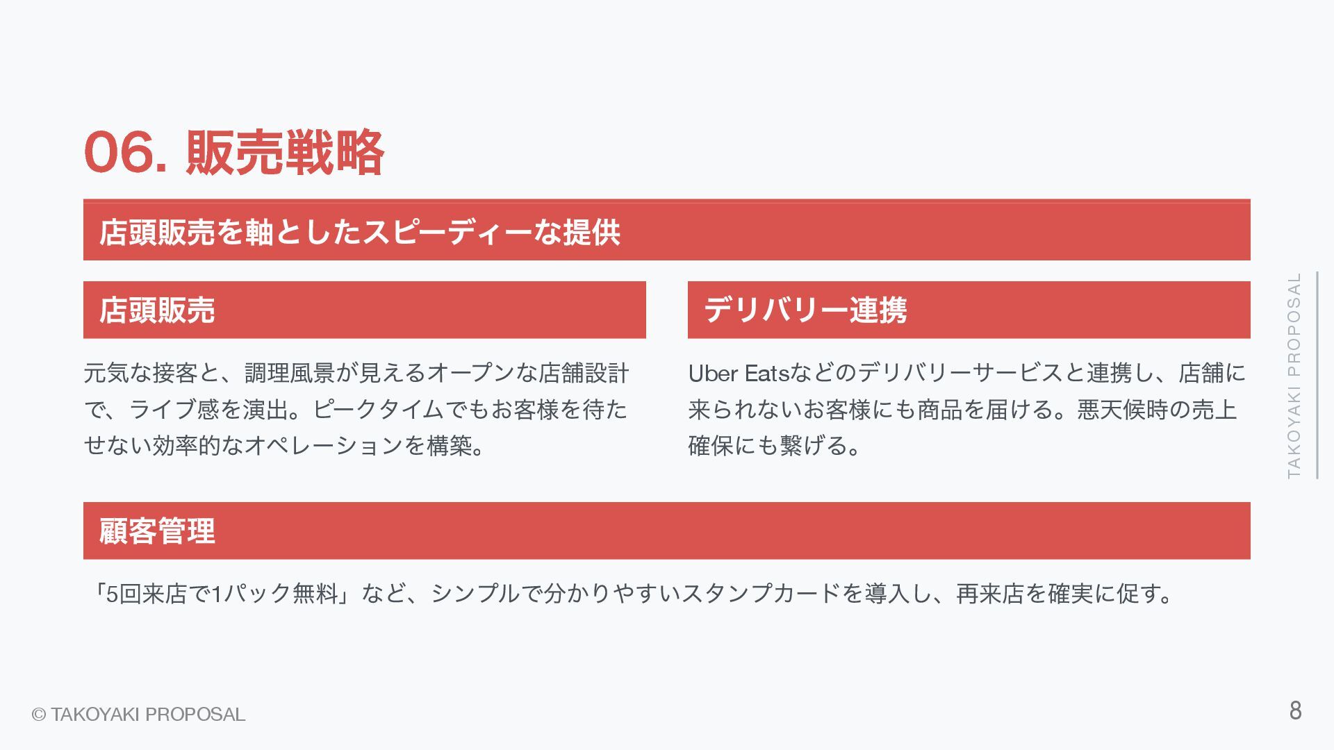 などのデリバリーサービスと連携し、店舗に 来られないお客様にも商品を届ける。悪天候時の売上 確保にも繋げる。 顧客管理 「5 回来店で1 パック無料」など、シンプルで分かりやすいスタンプカードを導入し、再来店を確実に促す。 TAKOYAKI PROPOSAL © TAKOYAKI PROPOSAL 8
