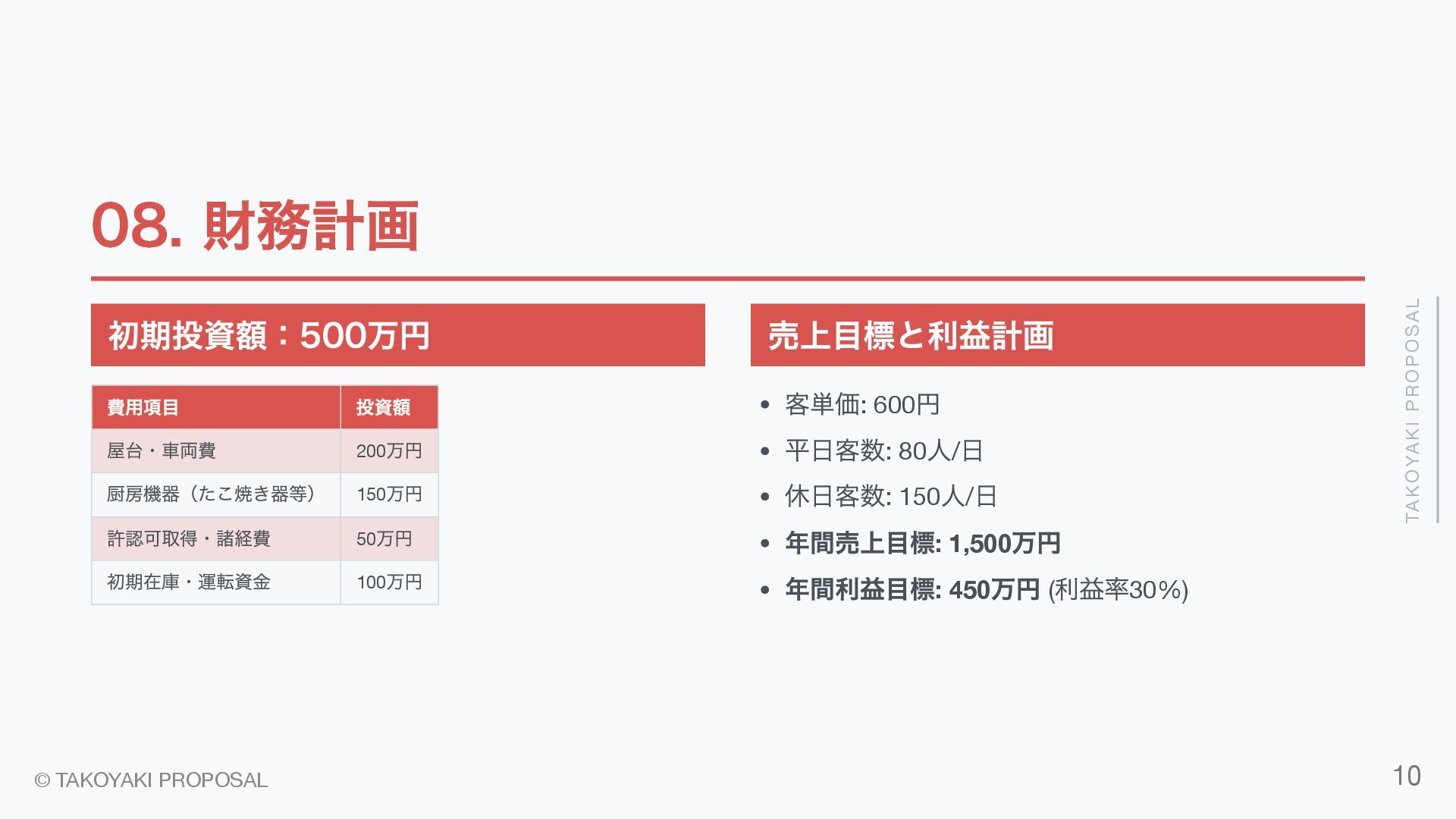 08. 財務計画 初期投資額:500万円 費用項目 投資額 屋台・車両費 200 万円 厨房機器(たこ焼き器等) 150