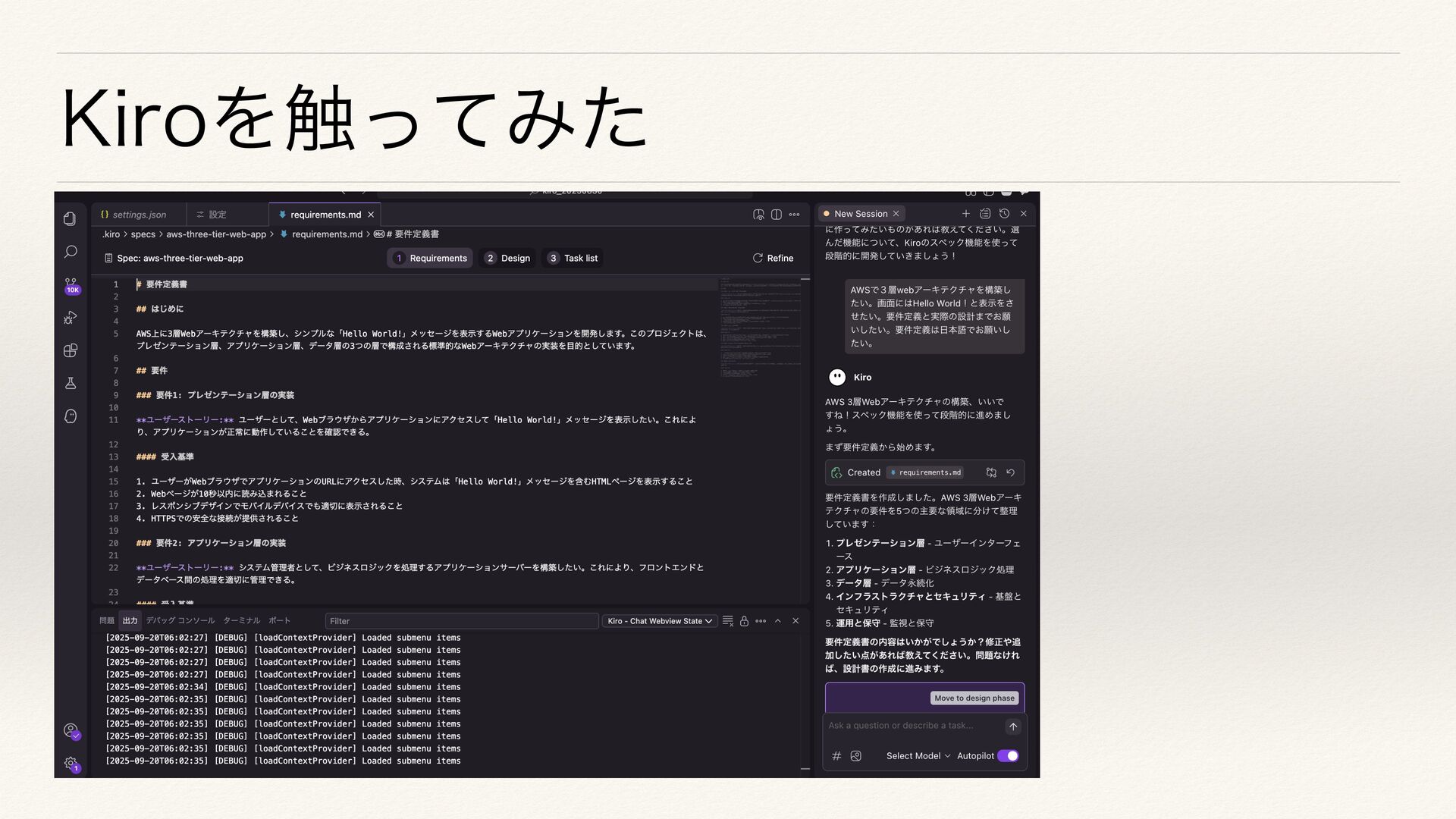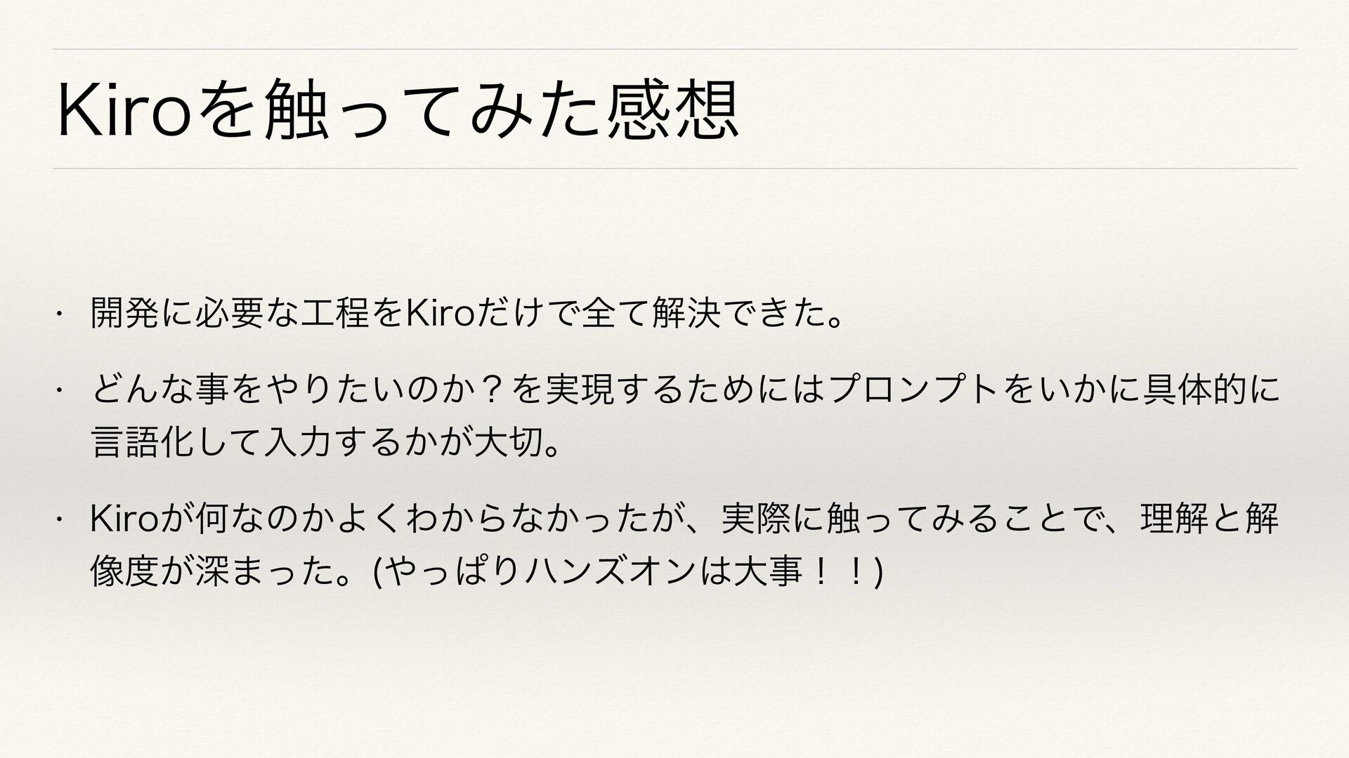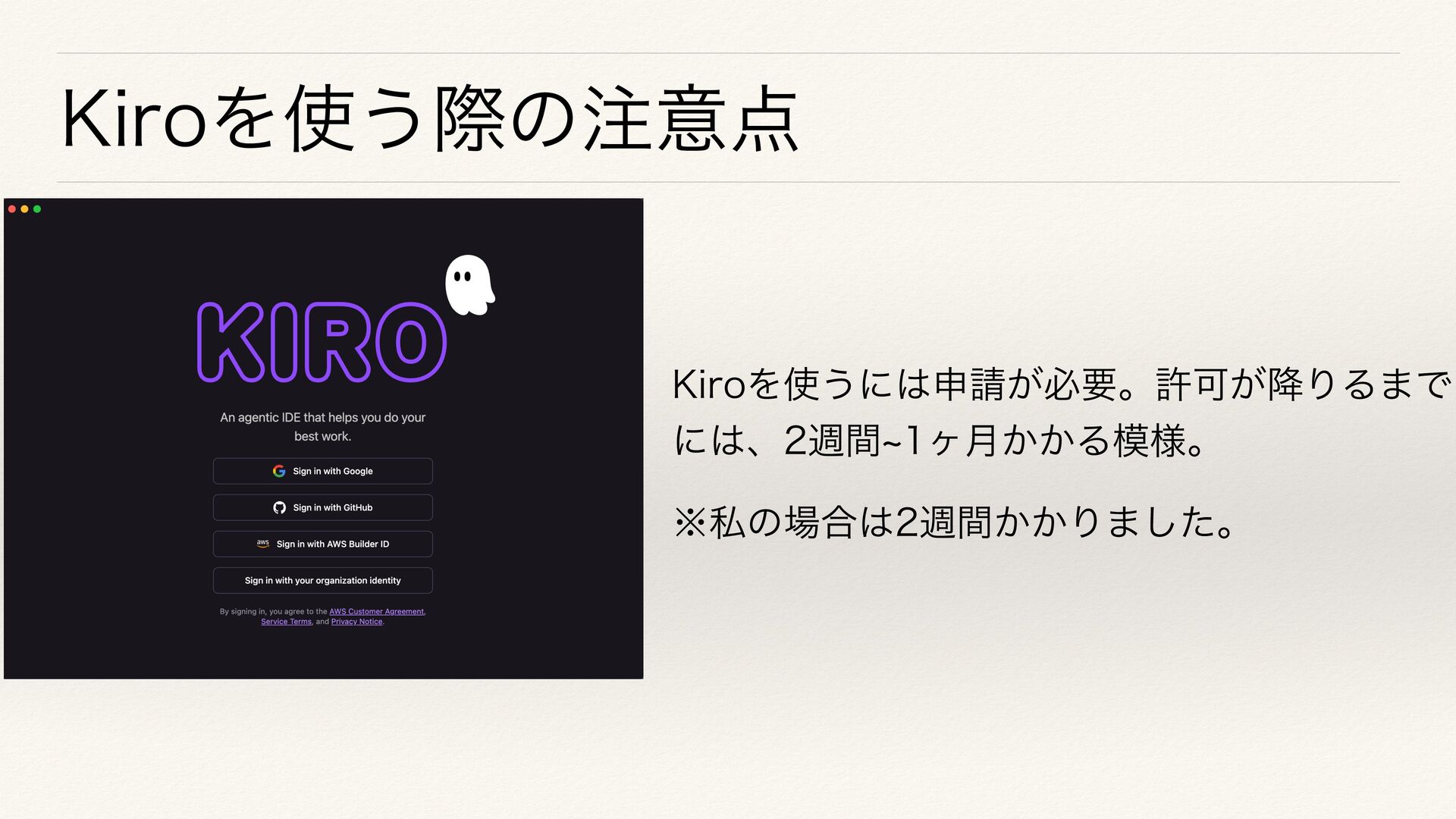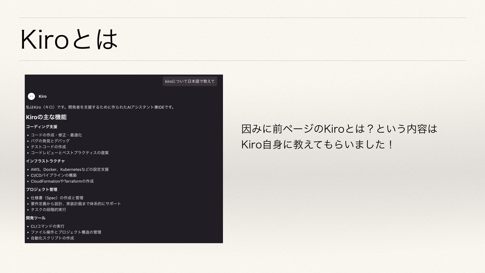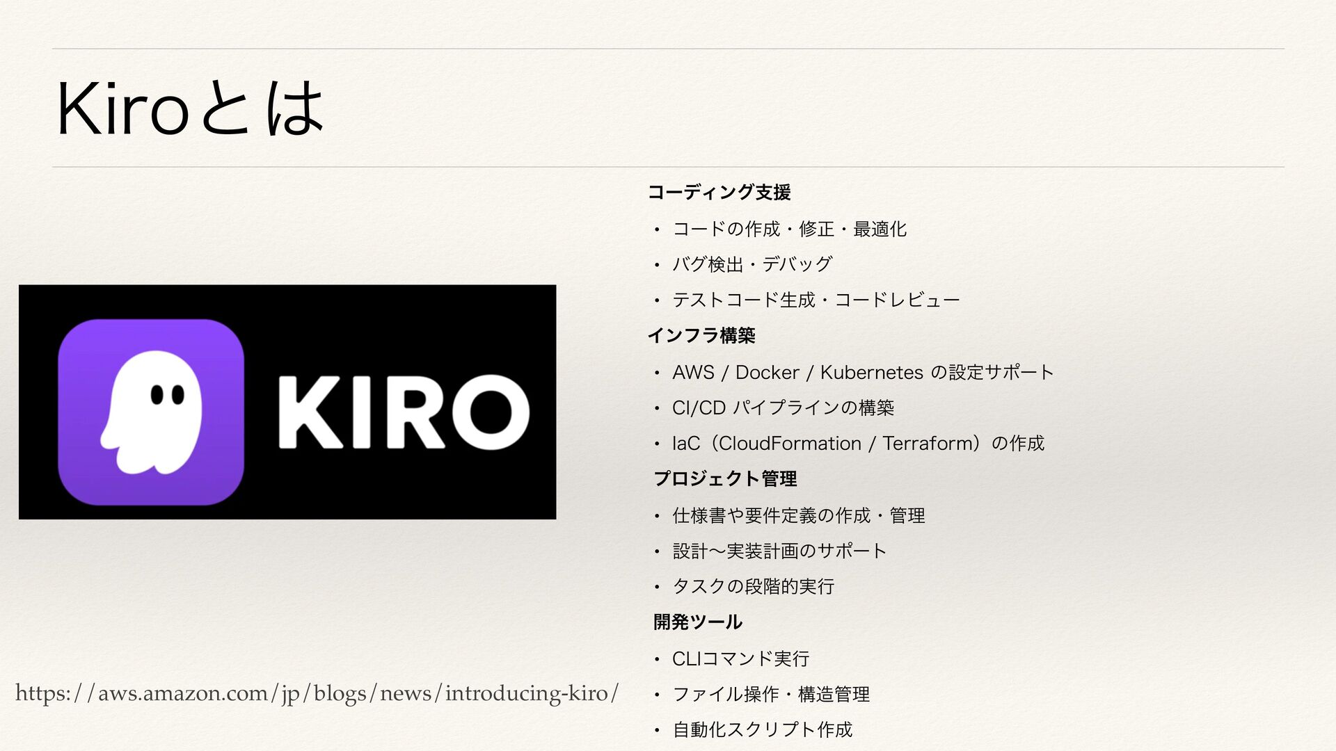"84%PDLFS,VCFSOFUFTͷઃఆαϙʔτ • $*$%ύΠϓϥΠϯͷߏங • *B$ʢ$MPVE'PSNBUJPO5FSSBGPSNʣͷ࡞ ϓϩδΣΫτཧ • ༷ॻཁ݅ఆٛͷ࡞ɾཧ • ઃܭʙ࣮ܭըͷαϙʔτ • λεΫͷஈ֊త࣮ߦ ։ൃπʔϧ • $-*ίϚϯυ࣮ߦ • ϑΝΠϧૢ࡞ɾߏཧ • ࣗಈԽεΫϦϓτ࡞ https://aws.amazon.com/jp/blogs/news/introducing-kiro/